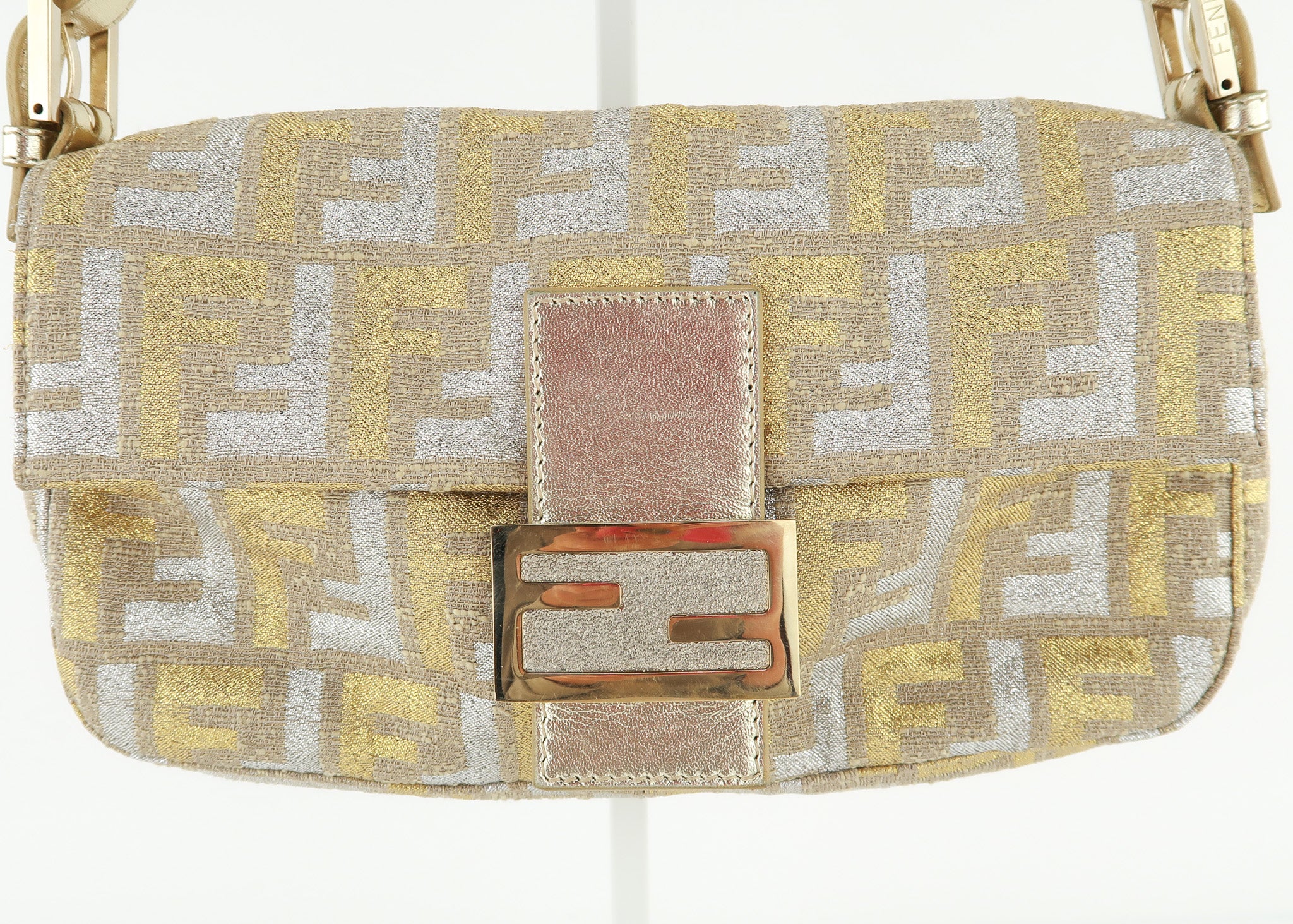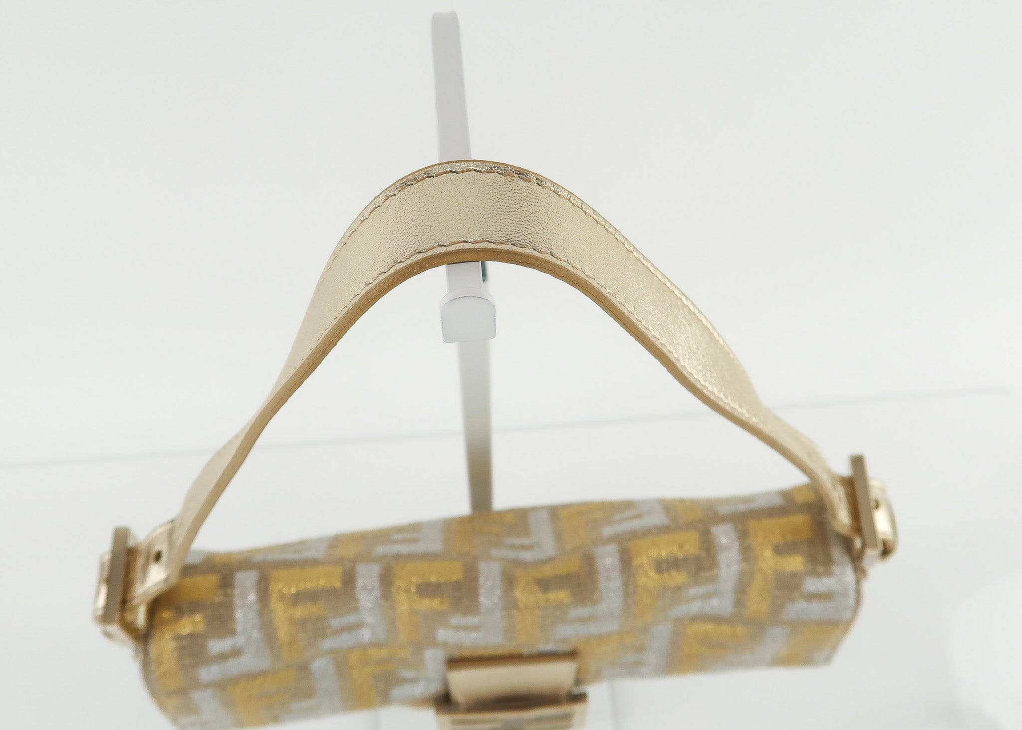 This Fendi Metallic Zucca Baguette in Gold and Silver features the iconic baguette style, shimmery gold and silver Zucca print on the outside, gold buckle, magnetic snap closure, roomy interior with zipper pocket and adjustable gold leather shoulder strap! Very rare! Designer Arm Candy guarantees 100% authenticity of this item. See pics for more details.