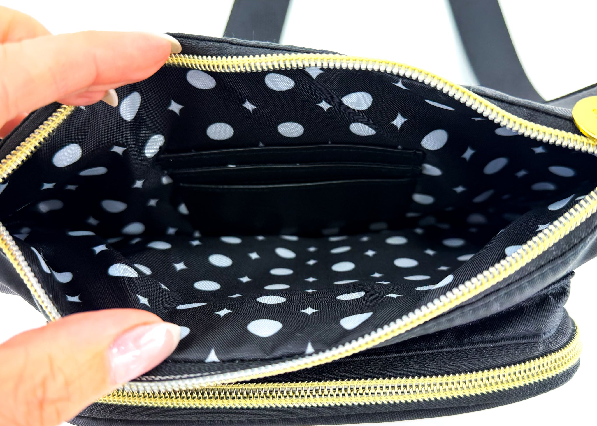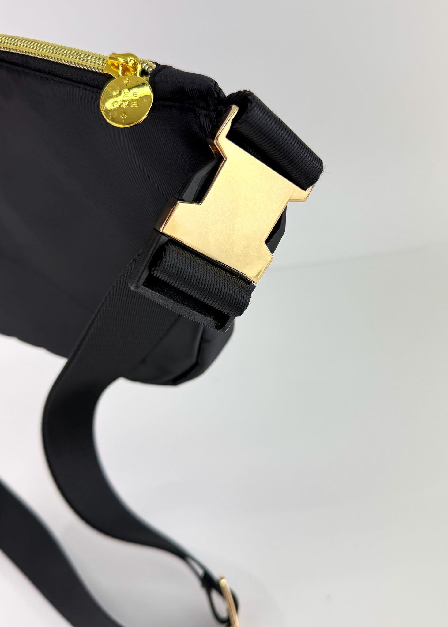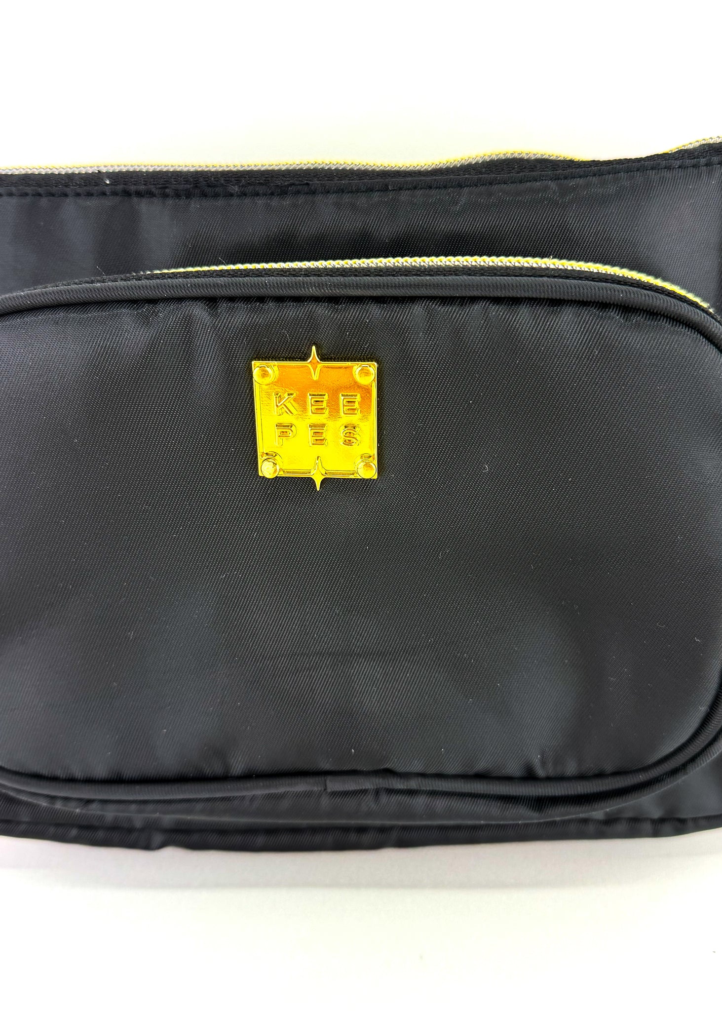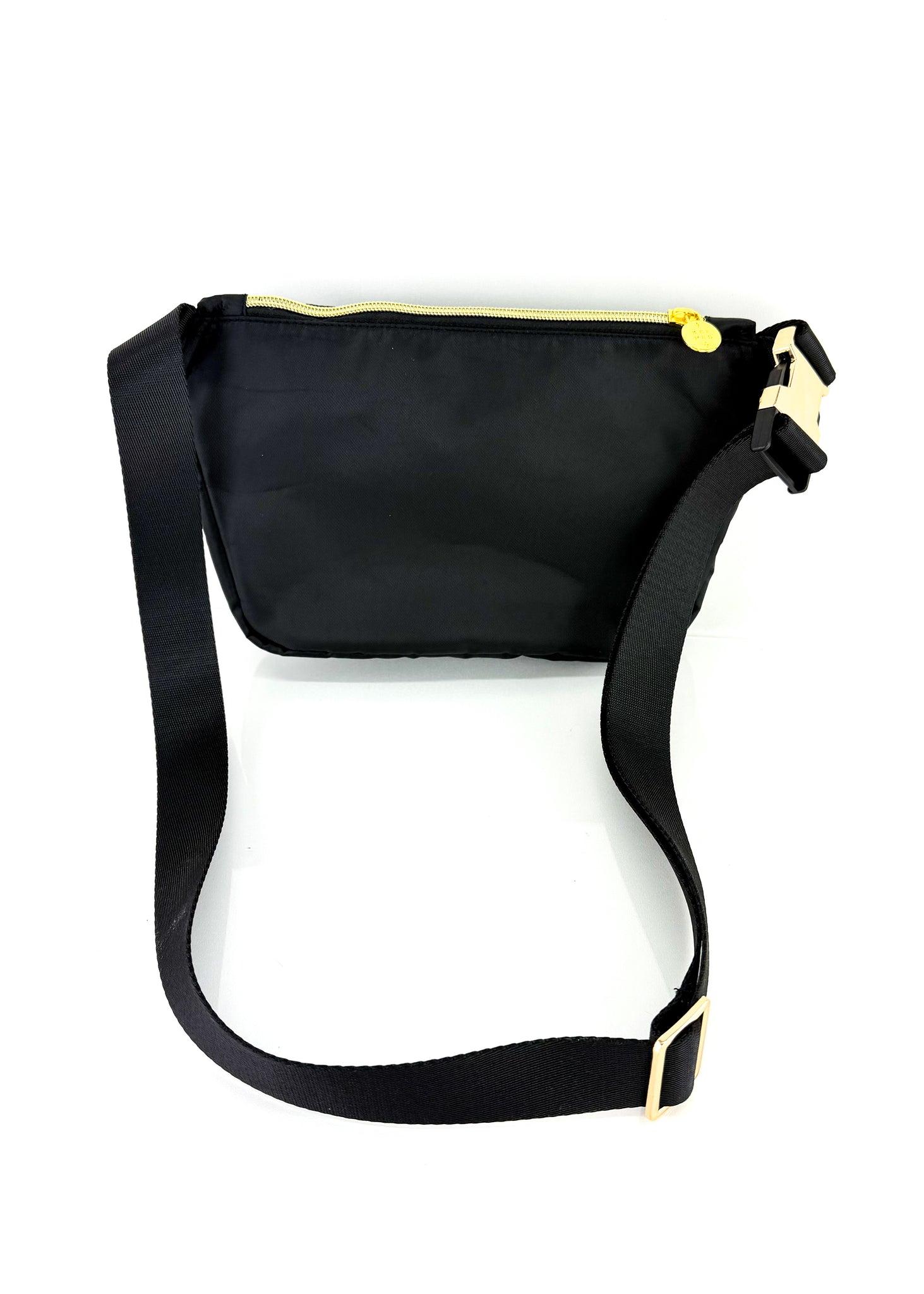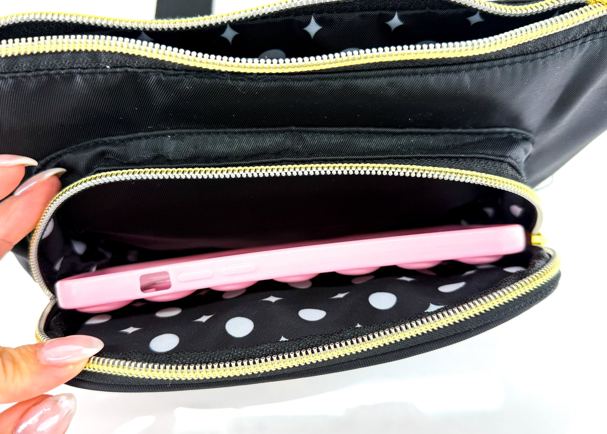 Ready to grab and go?! This Keepes Bumbag features a water resistant exterior, nylon exterior is high end, front zipper pocket that fits most large phones, main zipper pocket that fits all the essentials to grab and go! Plus the interior features our custom interior Diamonds in the Sky print in water resistant material and has a built in card holder! The strap is heavy duty, adjustable for most sizes and has an easy on and off buckle!