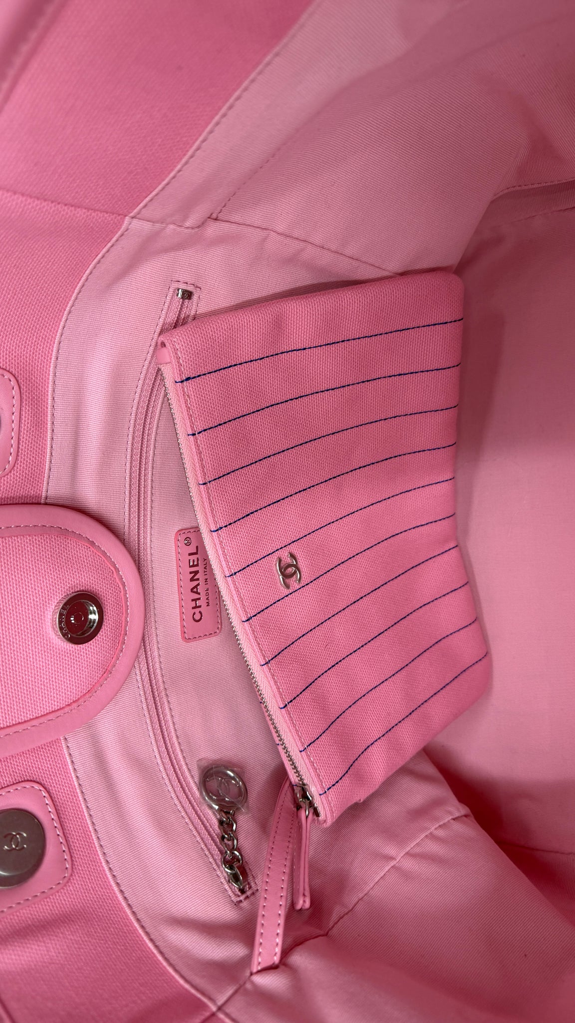 RARE PRINT!! This Chanel Canvas Calfskin Striped Large Deauville Tote in Pink features blue detailing, a baseball type font, leather handles, chain shoulder straps, large interior that is perfect for large items like laptops and a two way tote that makes it perfect for work, travel, diaper bag or as an everyday bag! Designer Arm Candy guarantees 100% authenticity of this item. See pics for more details.