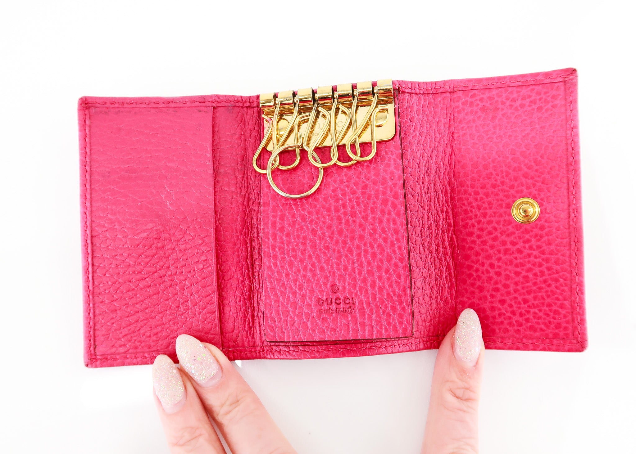 This Gucci Calfskin 6 Key Holder in Pink features a compact wallet design, snap closure, gold hardware detailing and 6 key holders on the inside with pocket. Designer Arm Candy guarantees 100% authenticity of this item. See pics for more details.