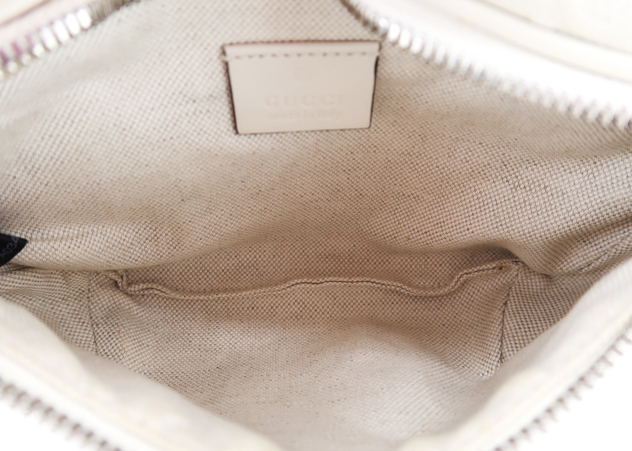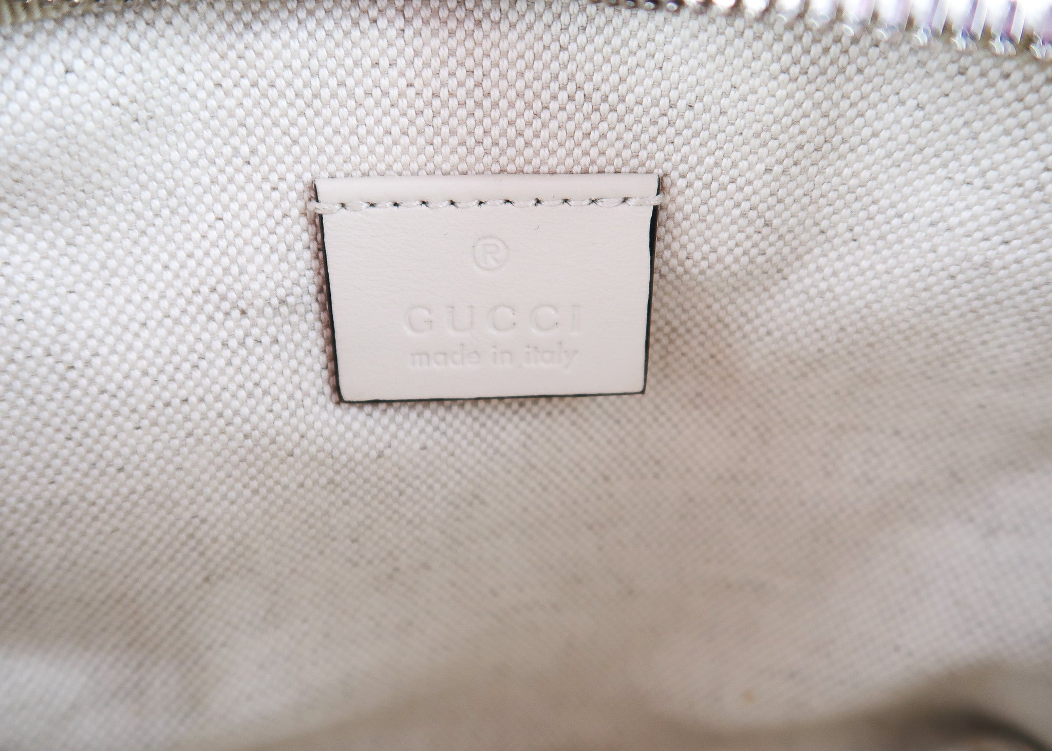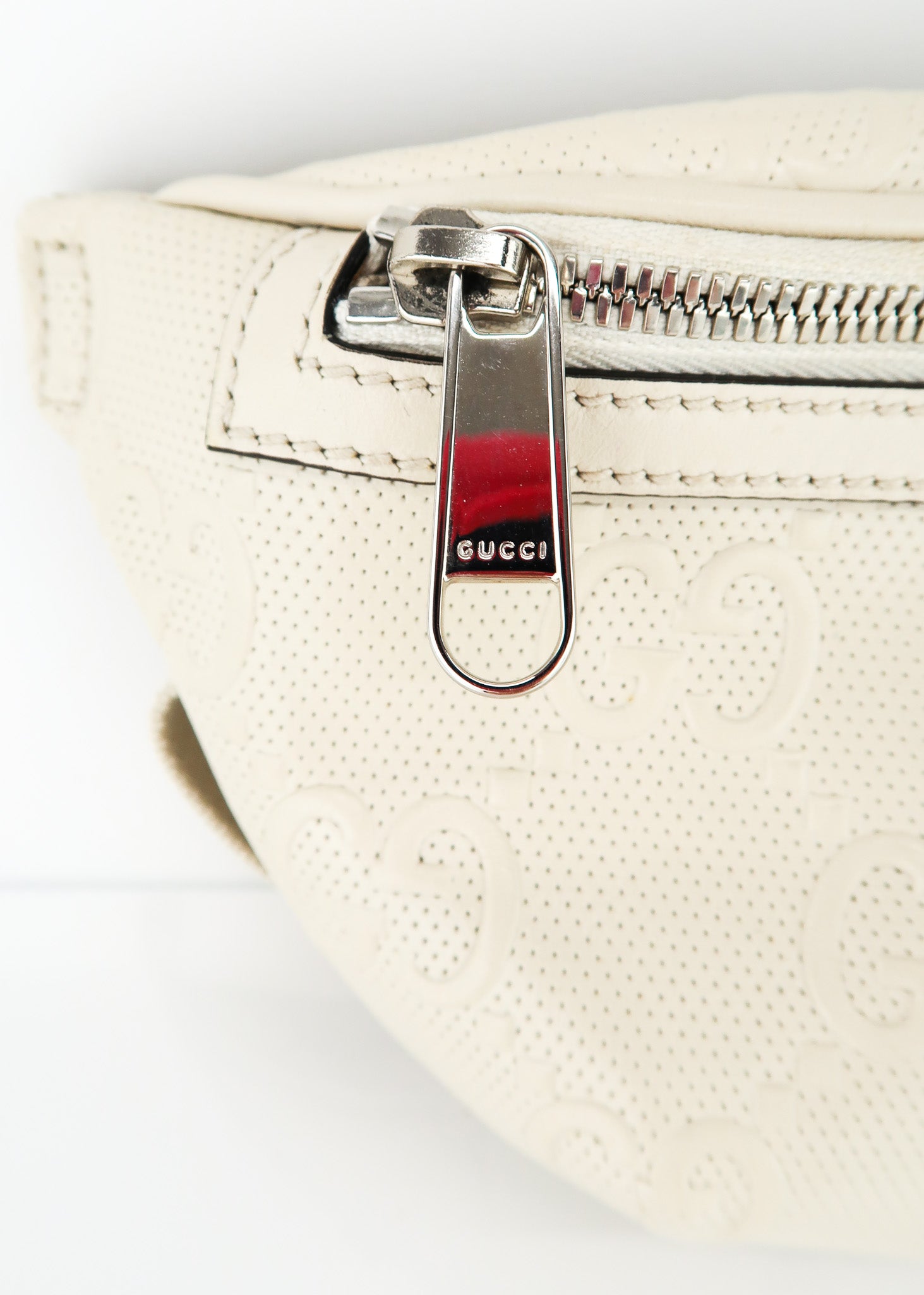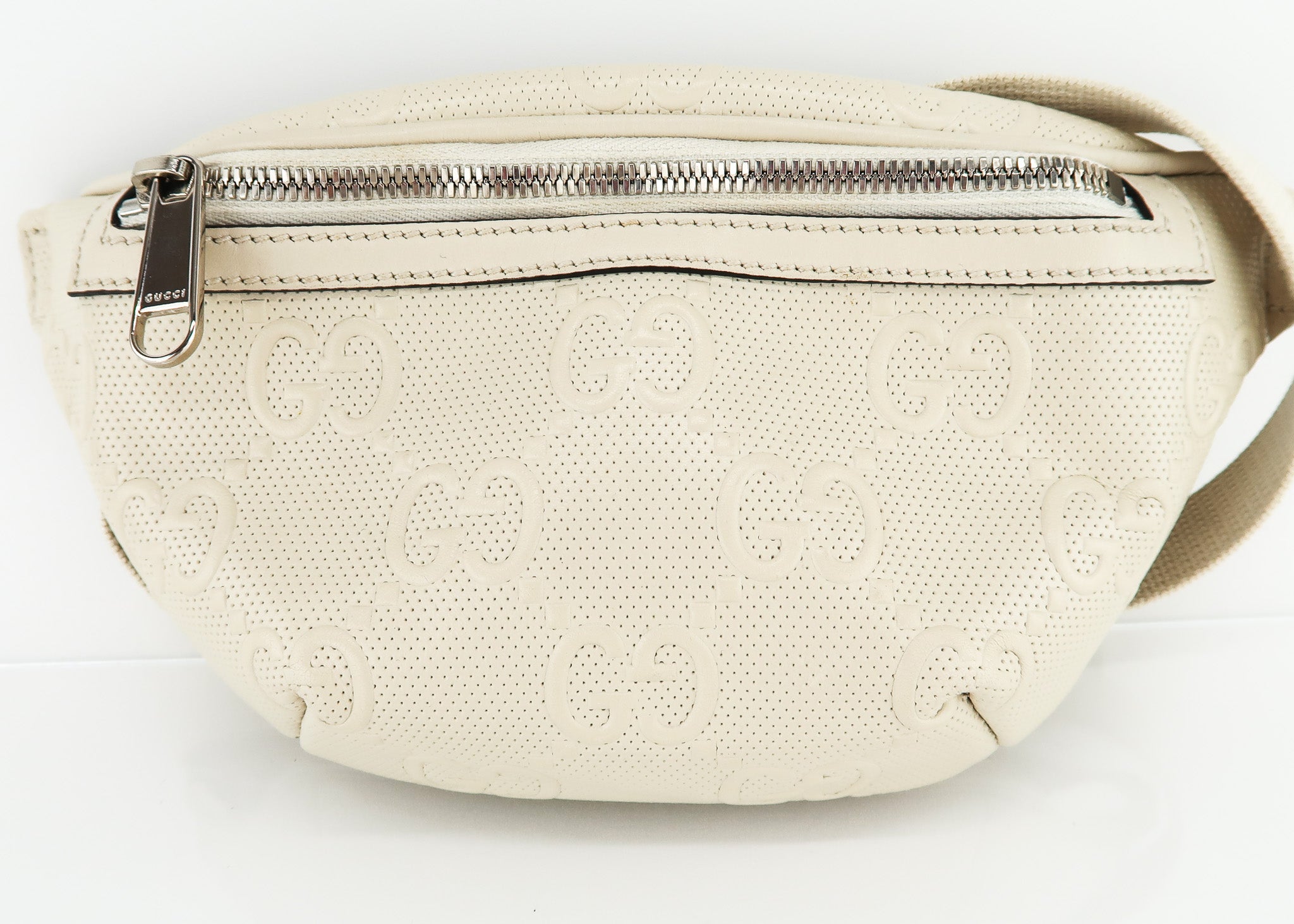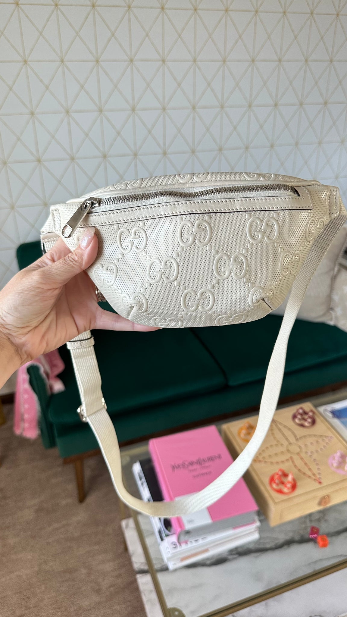 This Gucci Embossed Leather Bumbag in White features a waist bag style, embossed monogram on the exterior, zipper opening, interior that fits the essentials and an adjustable strap with buckle clasp for easy on and off! Designer Arm Candy guarantees 100% authenticity of this item. See pics for more details.