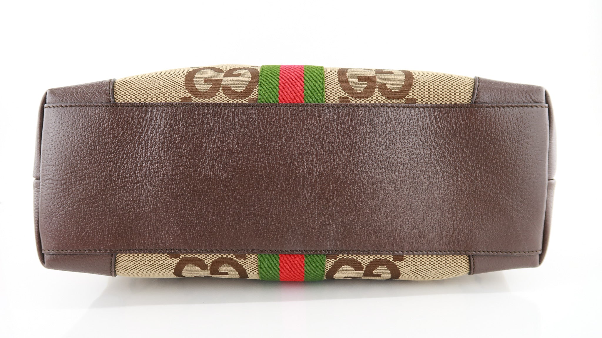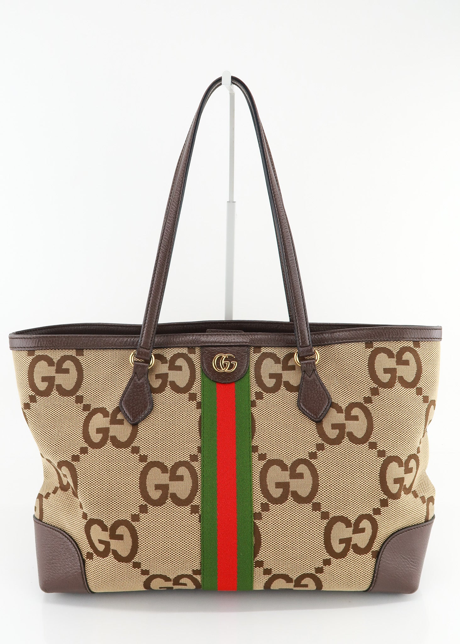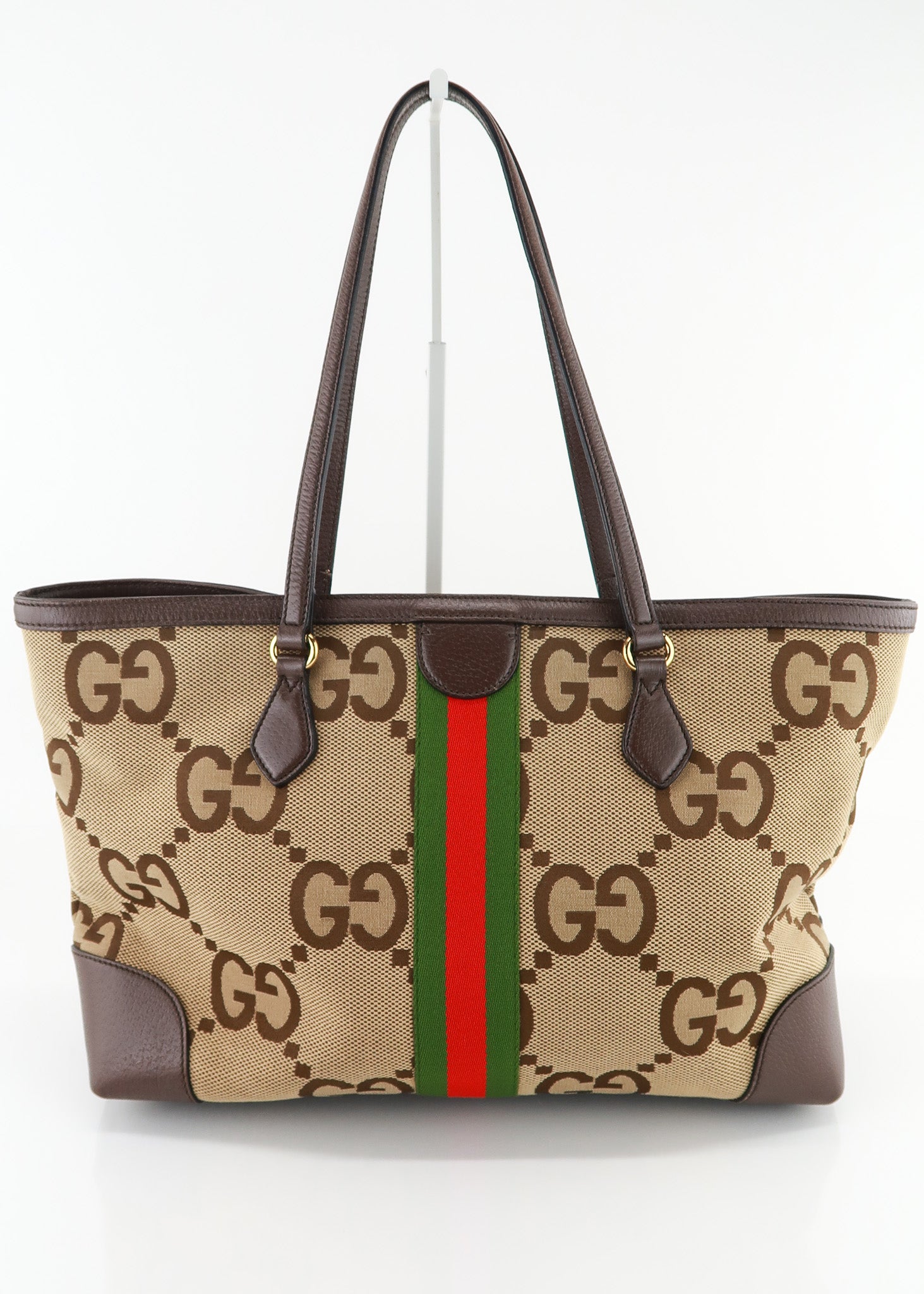 This Gucci Jumbo Monogram Ophidia Tote features a rectangle shape, jumbo monogram print with Ophidia logo on the exterior, leather base and straps, large interior and iconic green and red sherry stripe! Perfect for work, everyday or travel! Designer Arm Candy guarantees 100% authenticity of this item. See pics for more details.
