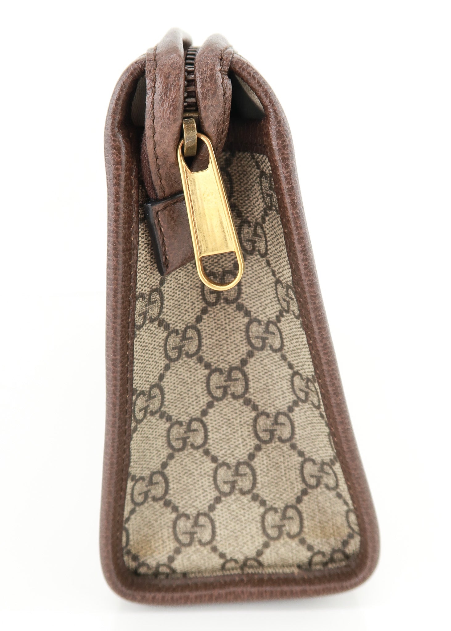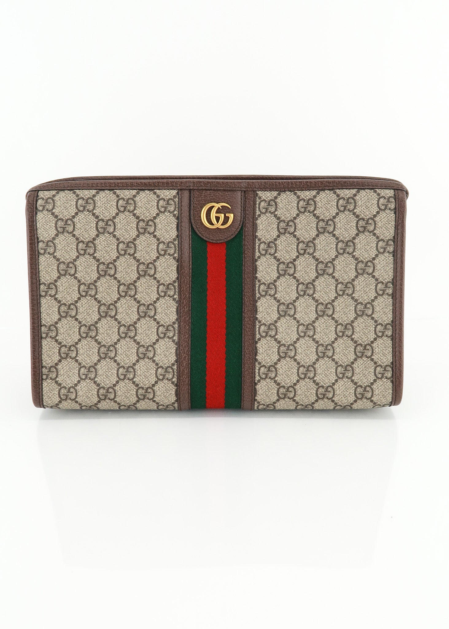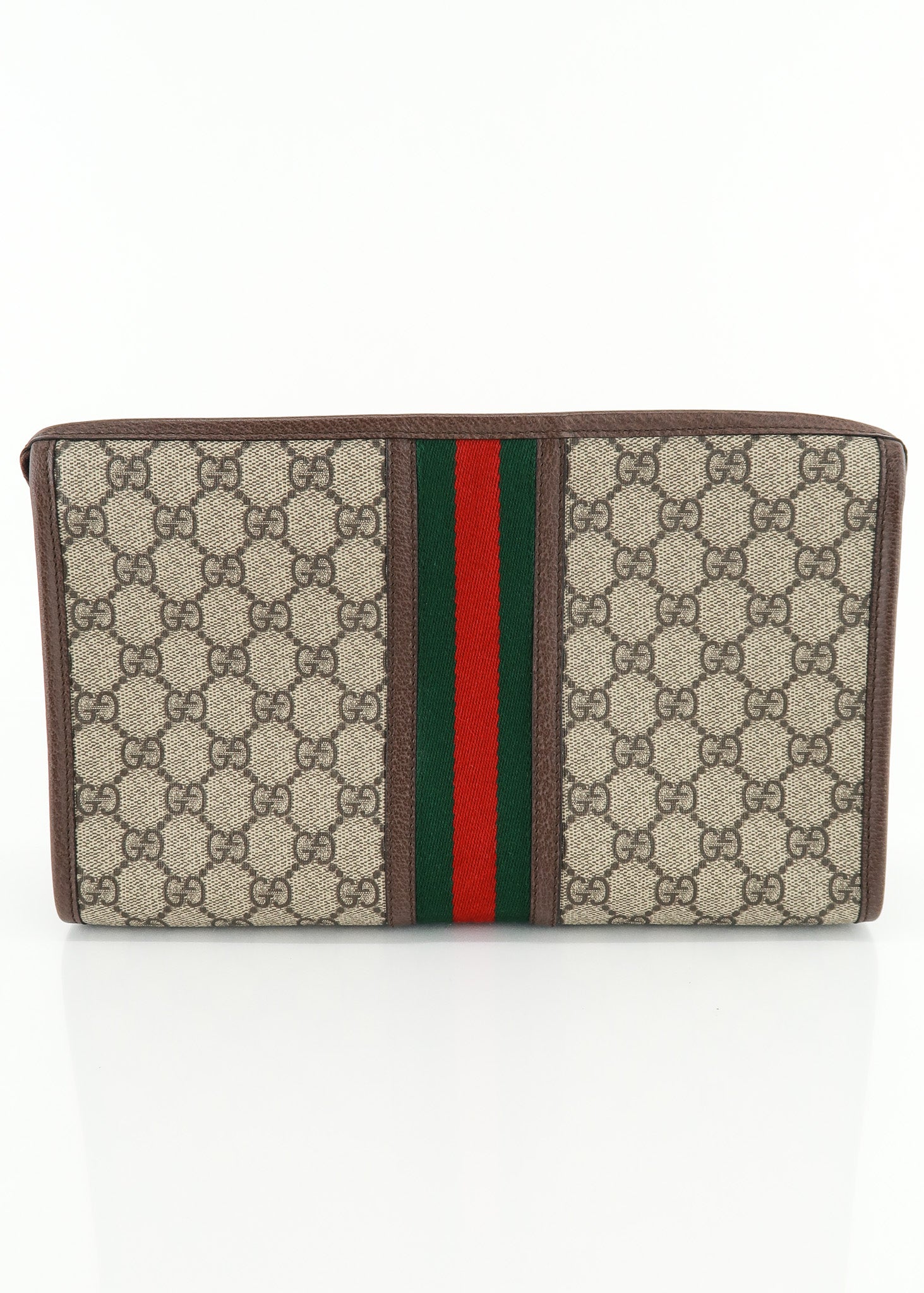 This Gucci Ophidia Supreme Canvas Clutch features a rectangle shape, supreme canvas body, sherry stripe detailing, zipper entry, roomy interior and interior zipper pocket! Perfect to use as a clutch or toiletry pouch! Designer Arm Candy guarantees 100% authenticity of this item. See pics for more details.