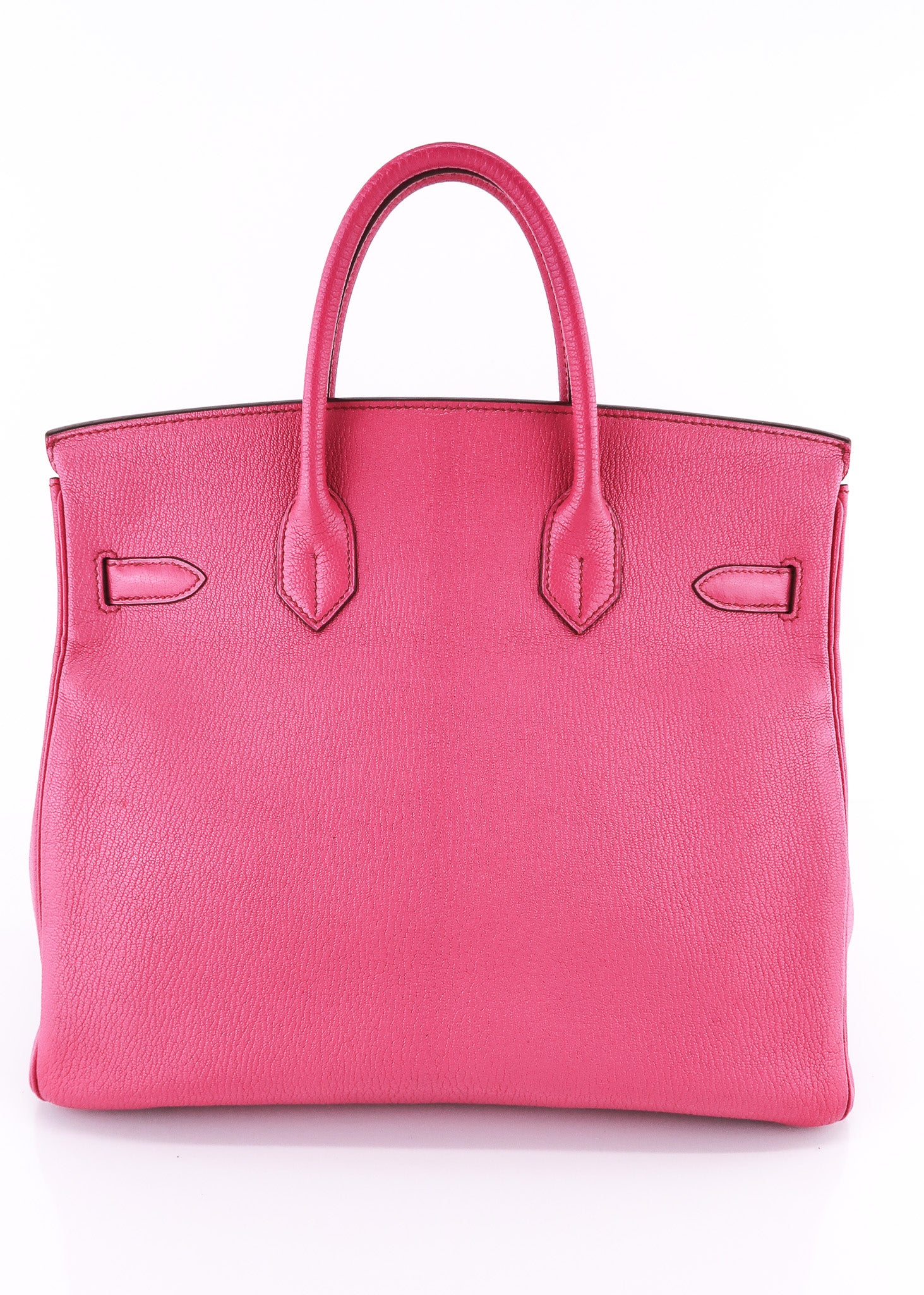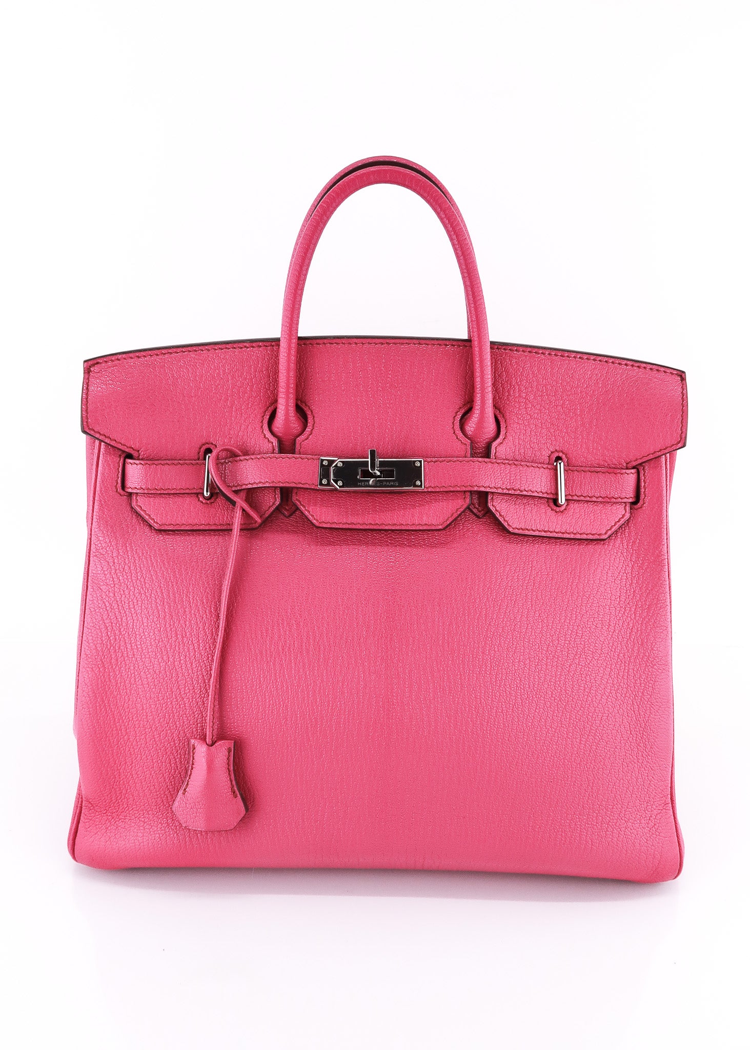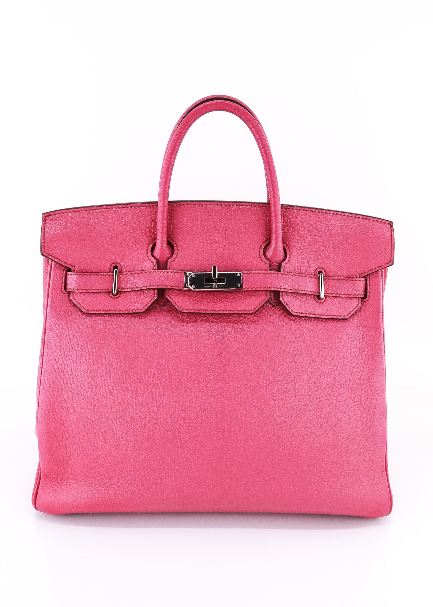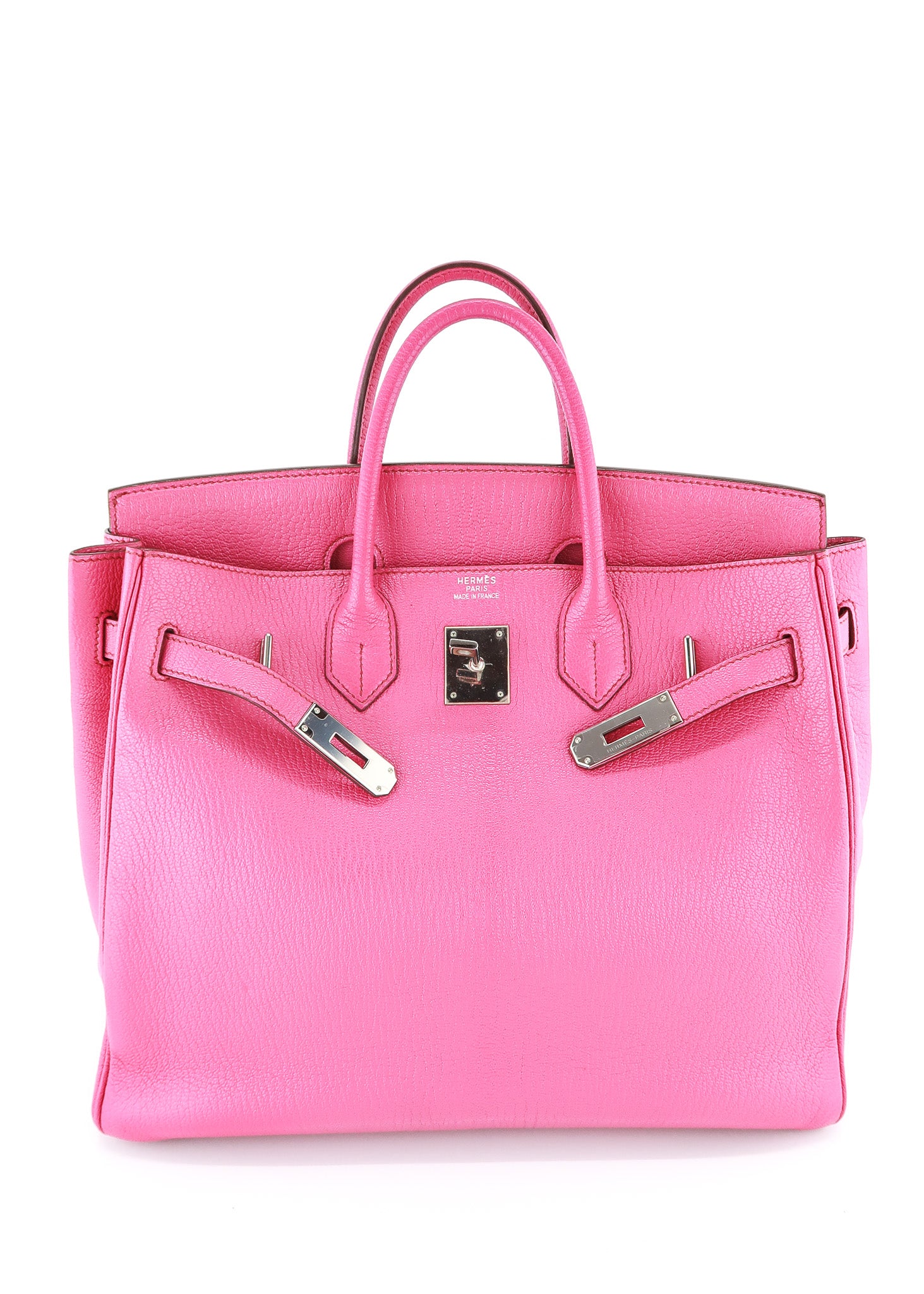 This Hermes Chèvre HAC Birkin 32 in Rose Shocking features the iconic shape, palladium hardware, roomy interior and is a piece of handbag history! The HAC was created by Emile-Maurice Hermes in 1892! The Chèvre leather is so prestige and is now only used in special order pieces! Don't miss out on this amazing deal! Designer Arm Candy guarantees 100% authenticity of this item. See pics for more details.