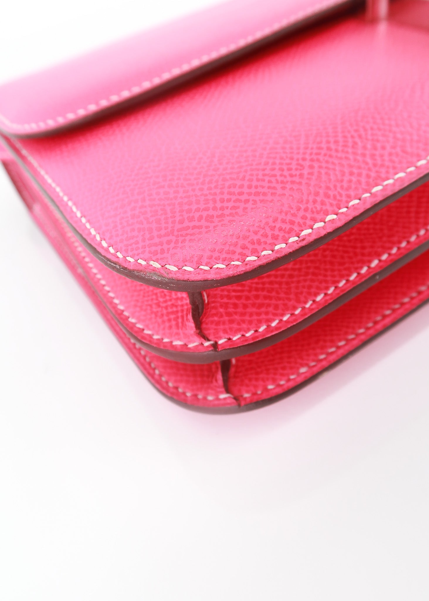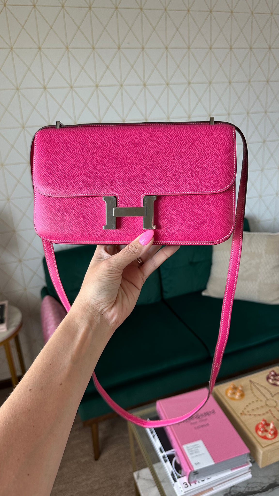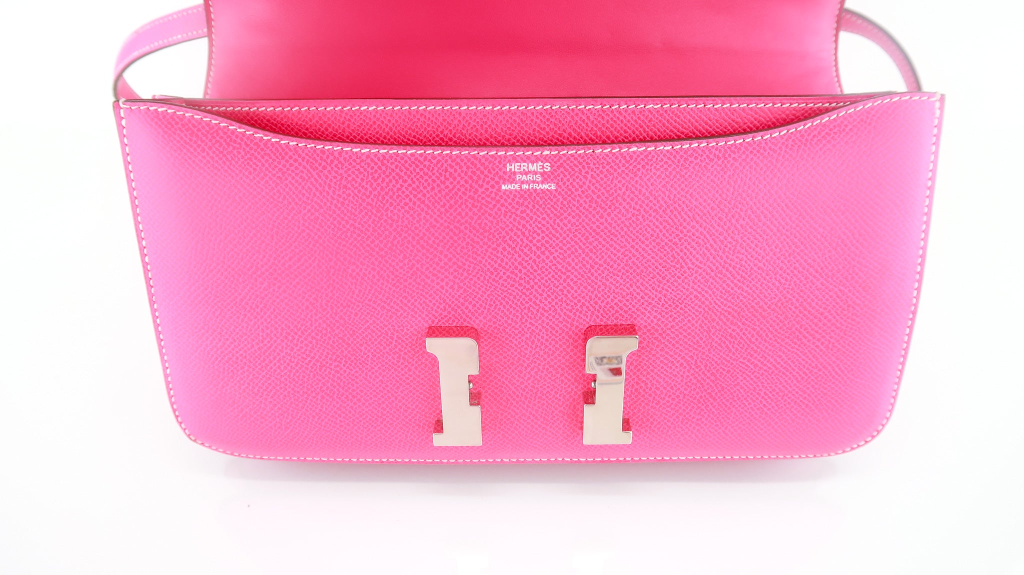 This Hermes Epsom Constance Elan in Rose Tyrein features a compact design without sacrificing space with its two big compartments, built in card holder and strap that can be doubled up to wear on shoulder or long to wear crossbody! This is the original version of the Constance and is hard to find in this condition, color and with the candy stitching! Designer Arm Candy guarantees 100% authenticity of this item. See pics for more details.
