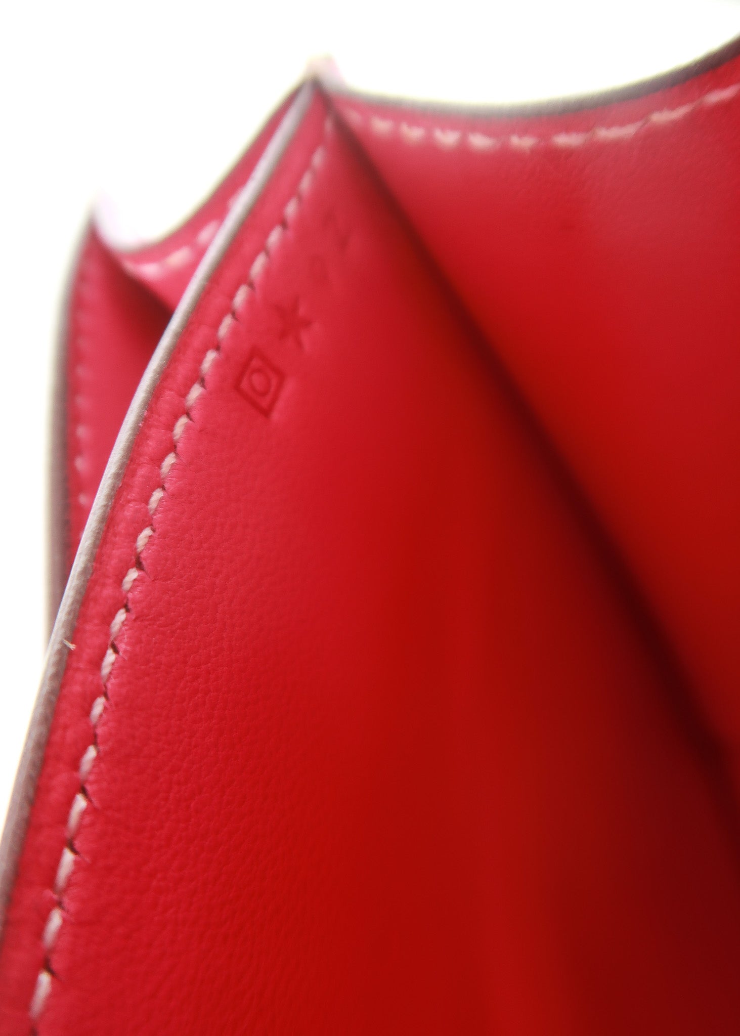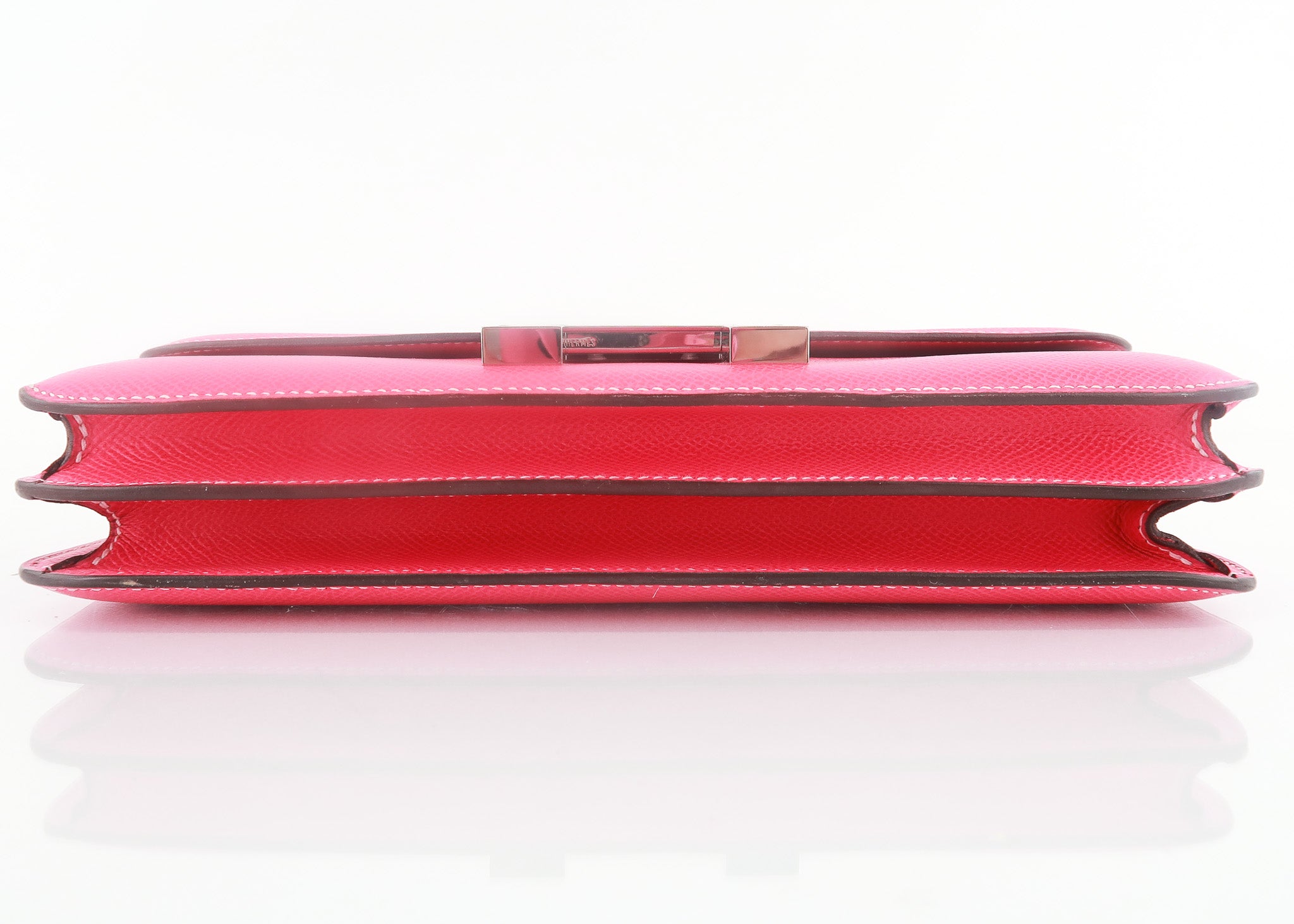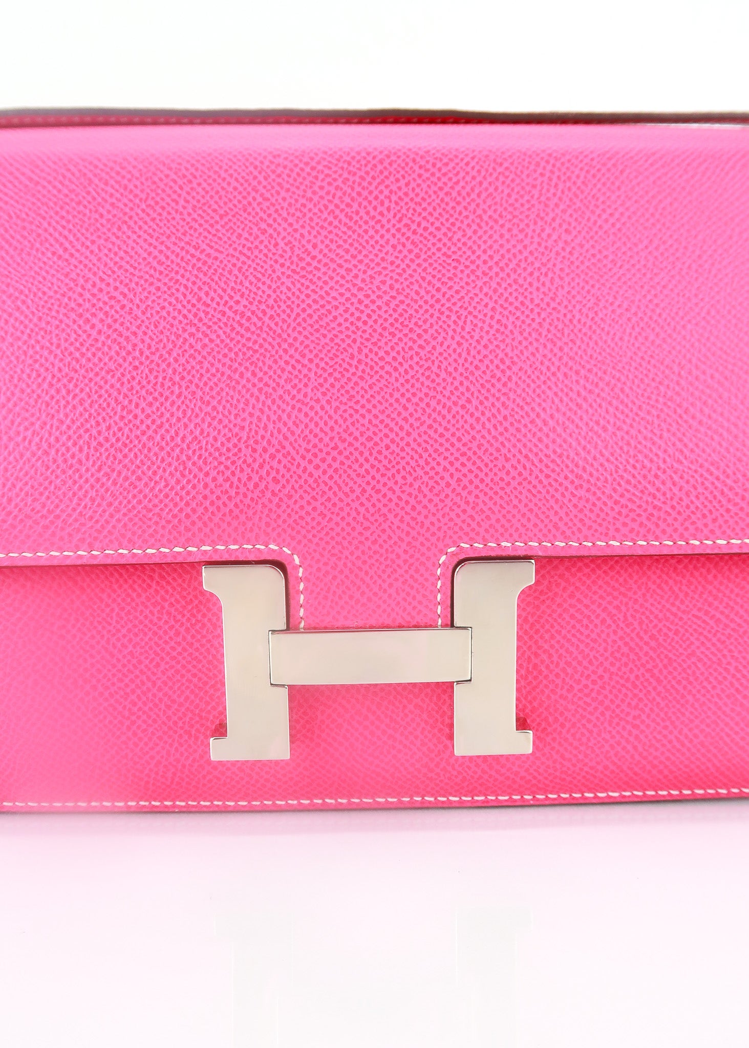 This Hermes Epsom Constance Elan in Rose Tyrein features a compact design without sacrificing space with its two big compartments, built in card holder and strap that can be doubled up to wear on shoulder or long to wear crossbody! This is the original version of the Constance and is hard to find in this condition, color and with the candy stitching! Designer Arm Candy guarantees 100% authenticity of this item. See pics for more details.