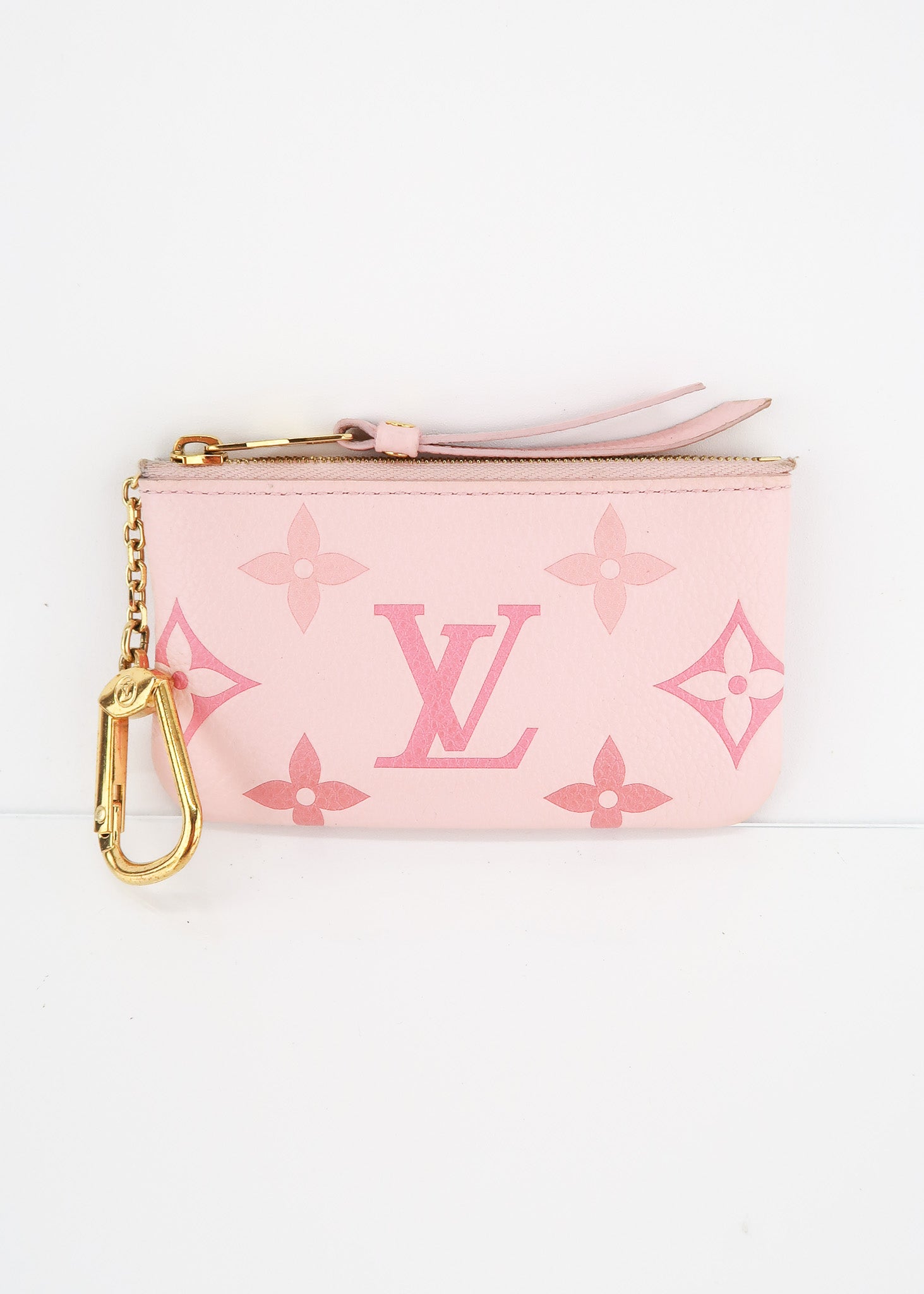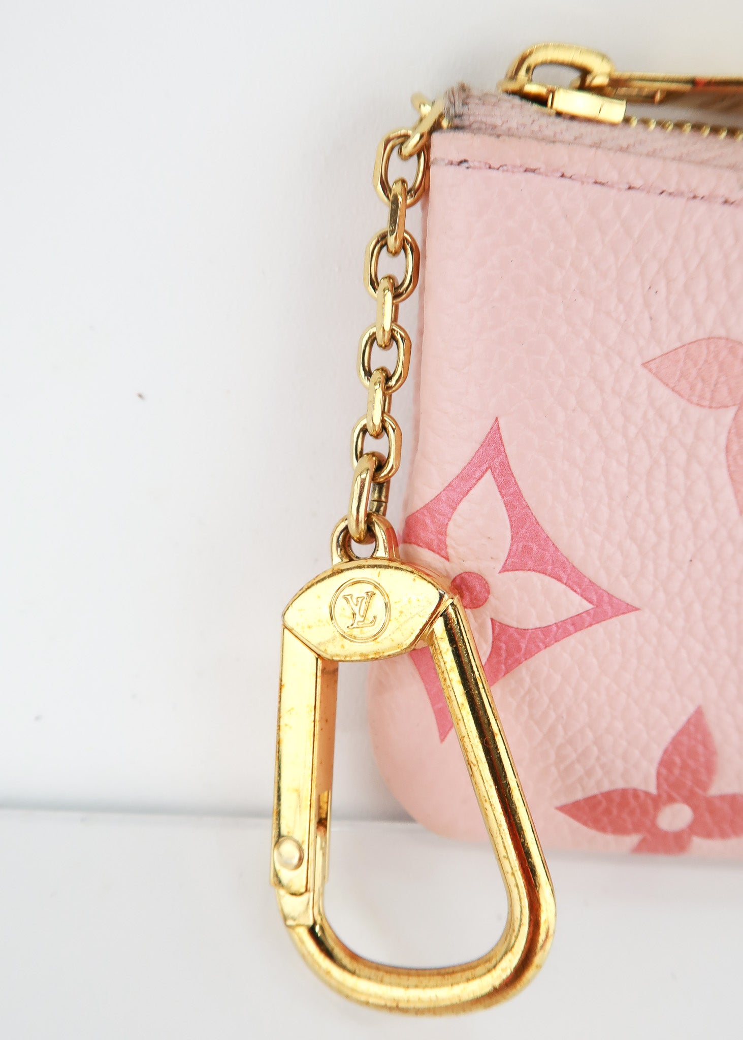 This Louis Vuitton Empreinte Key Pouch in Limited Edition Pink features zipper top, chain with clasp and interior that fits cards and some cash/coin. Designer Arm Candy guarantees 100% authenticity of this item. See pics for more details.