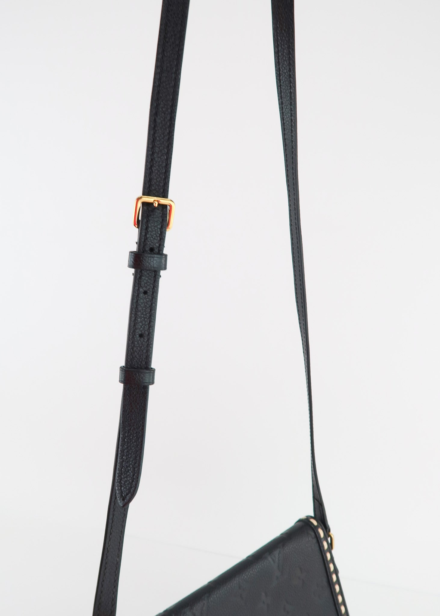 This Louis Vuitton Empreinte Junot in Black features a saddle bag shape, black exterior with white stitch detailing, push lock entry, large interior that fits most wallets/big phones plus more and adjustable crossbody strap. Hard to find color since it's been discontinued! Designer Arm Candy guarantees 100% authenticity of this item. See pics for more details.