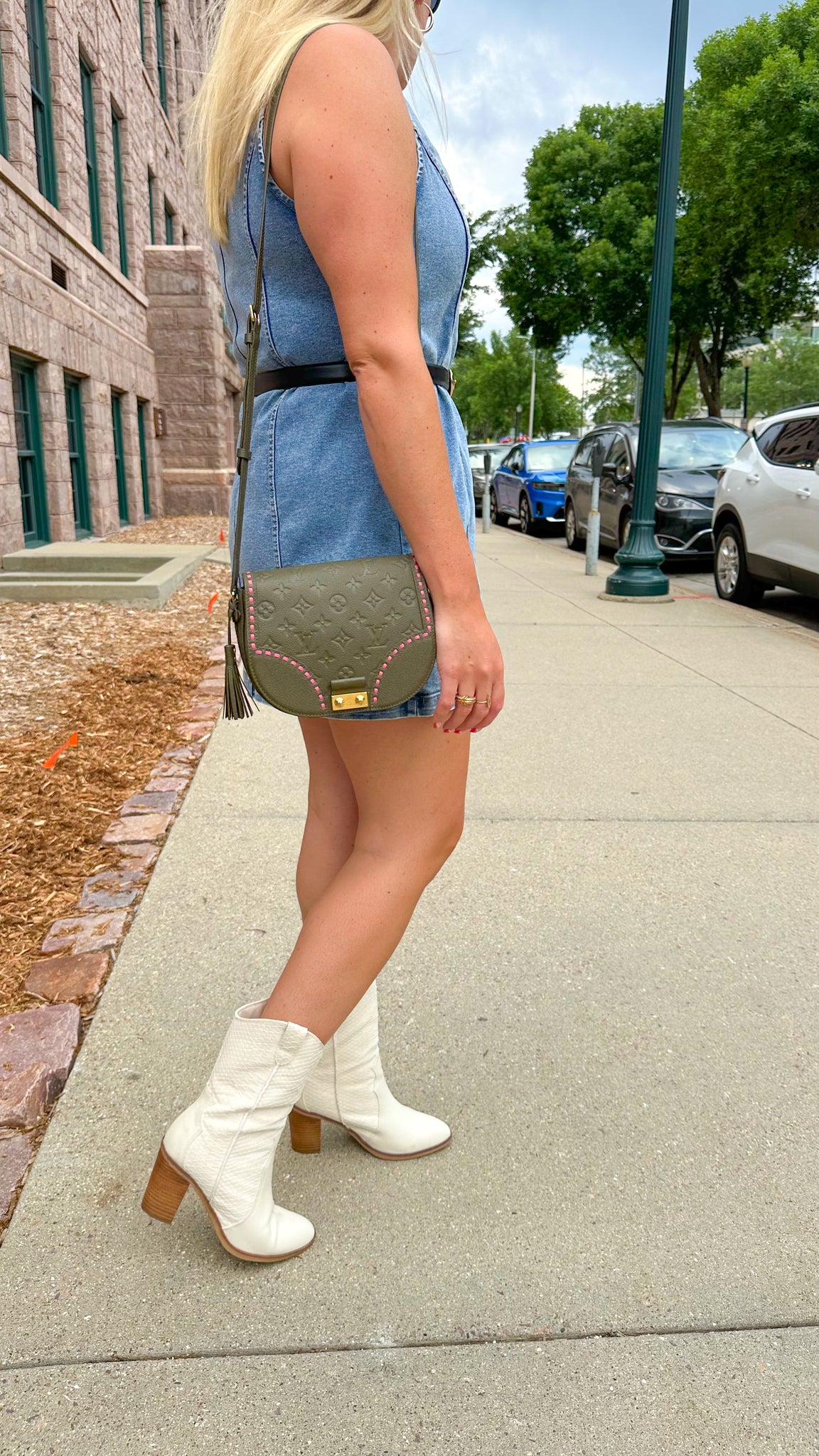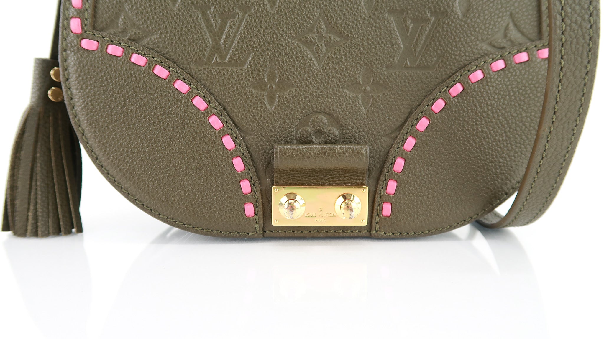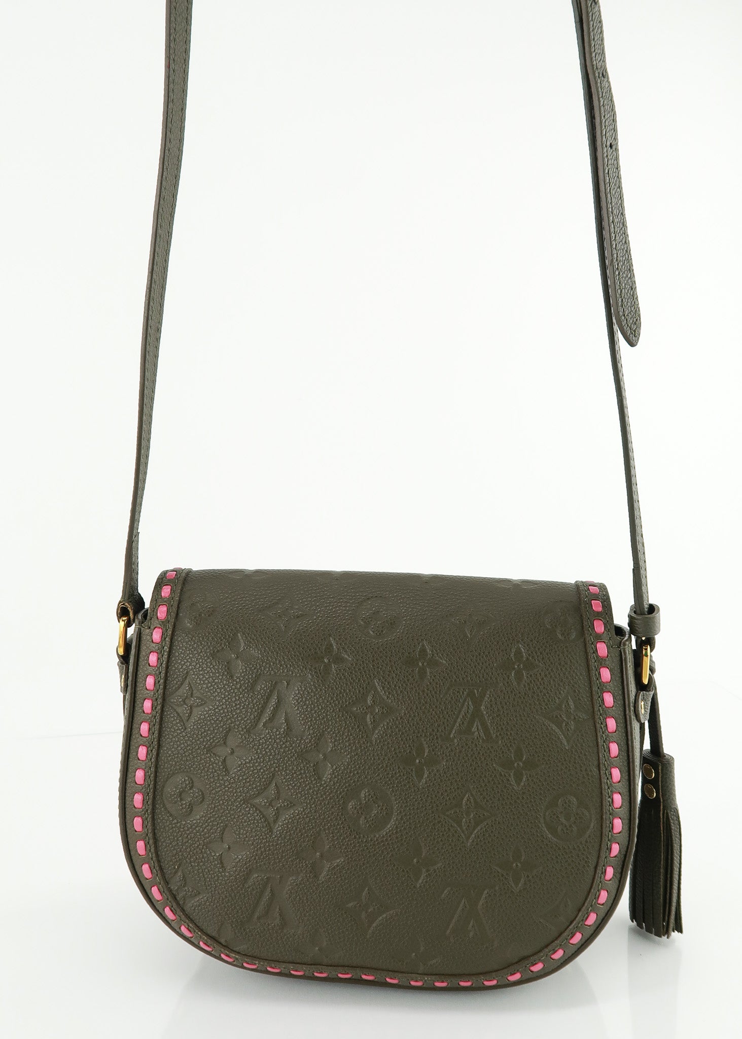 This Louis Vuitton Empreinte Junot in Green features a saddle bag shape, olive green exterior with pink stitch detailing, push lock entry, large interior that fits most wallets/bi phones plus more and adjustable crossbody strap. Hard to find color since it's been discontinued! Designer Arm Candy guarantees 100% authenticity of this item. See pics for more details.