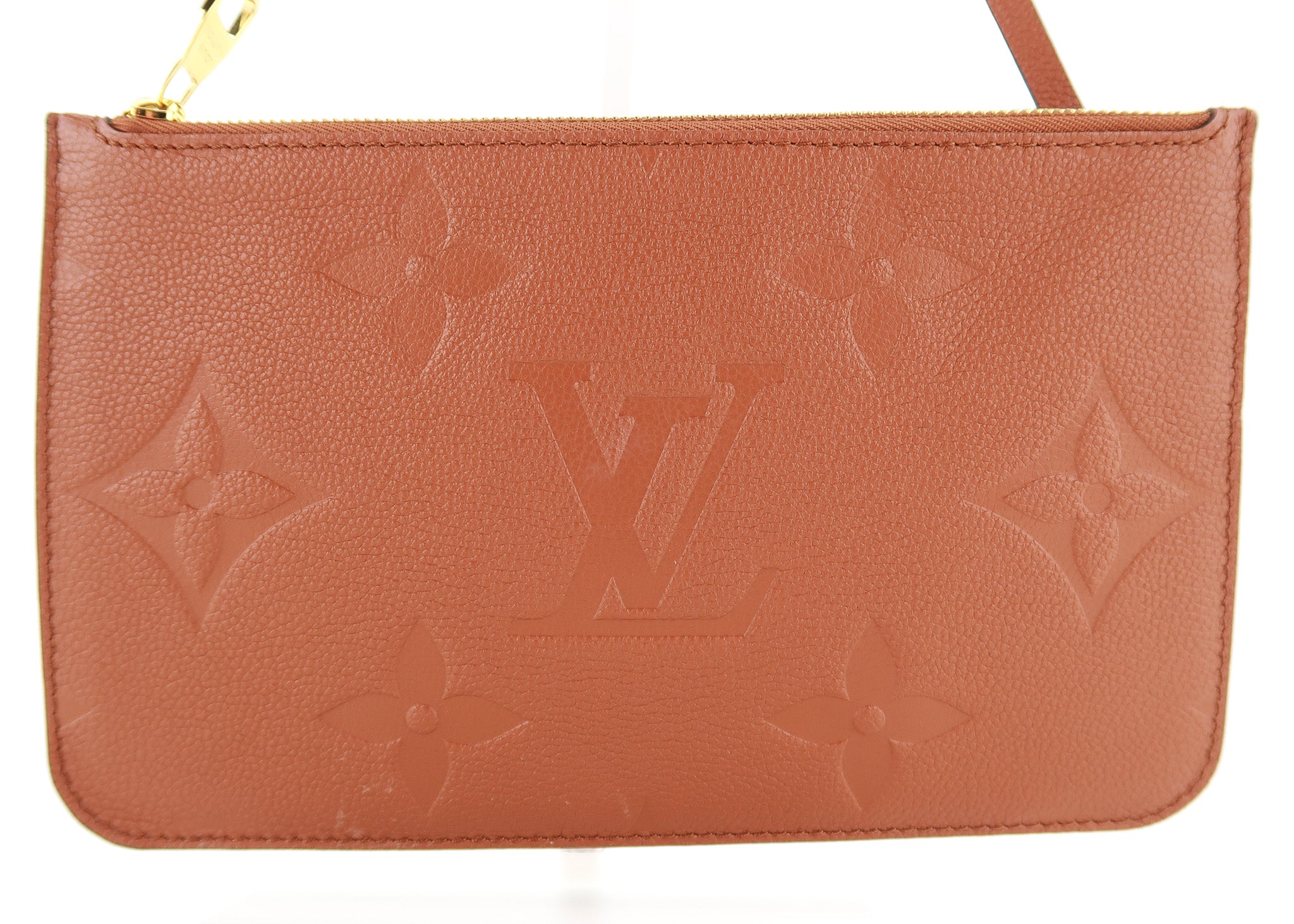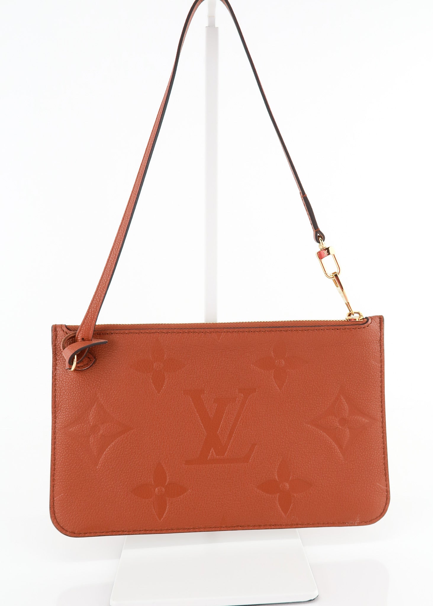 Dress up your look with this cognac LV Pochette in Empreinte Leather! The pochette features a wristlet strap, giant monogram print, lined interior and can be worn as a wristlet, arm bag or shoulder bag. Designer Arm Candy guarantees 100% authenticity of this item. See pics for more details.