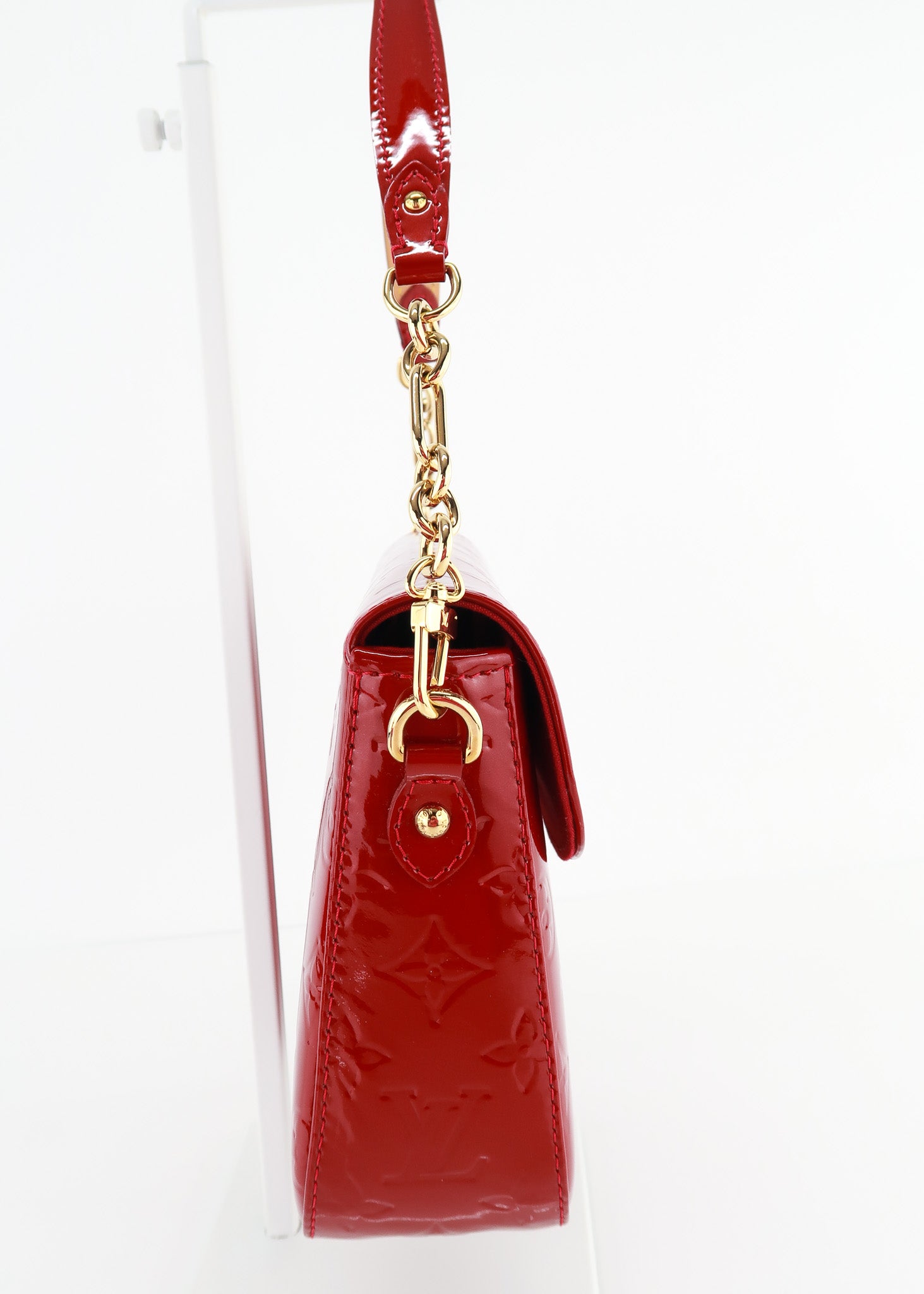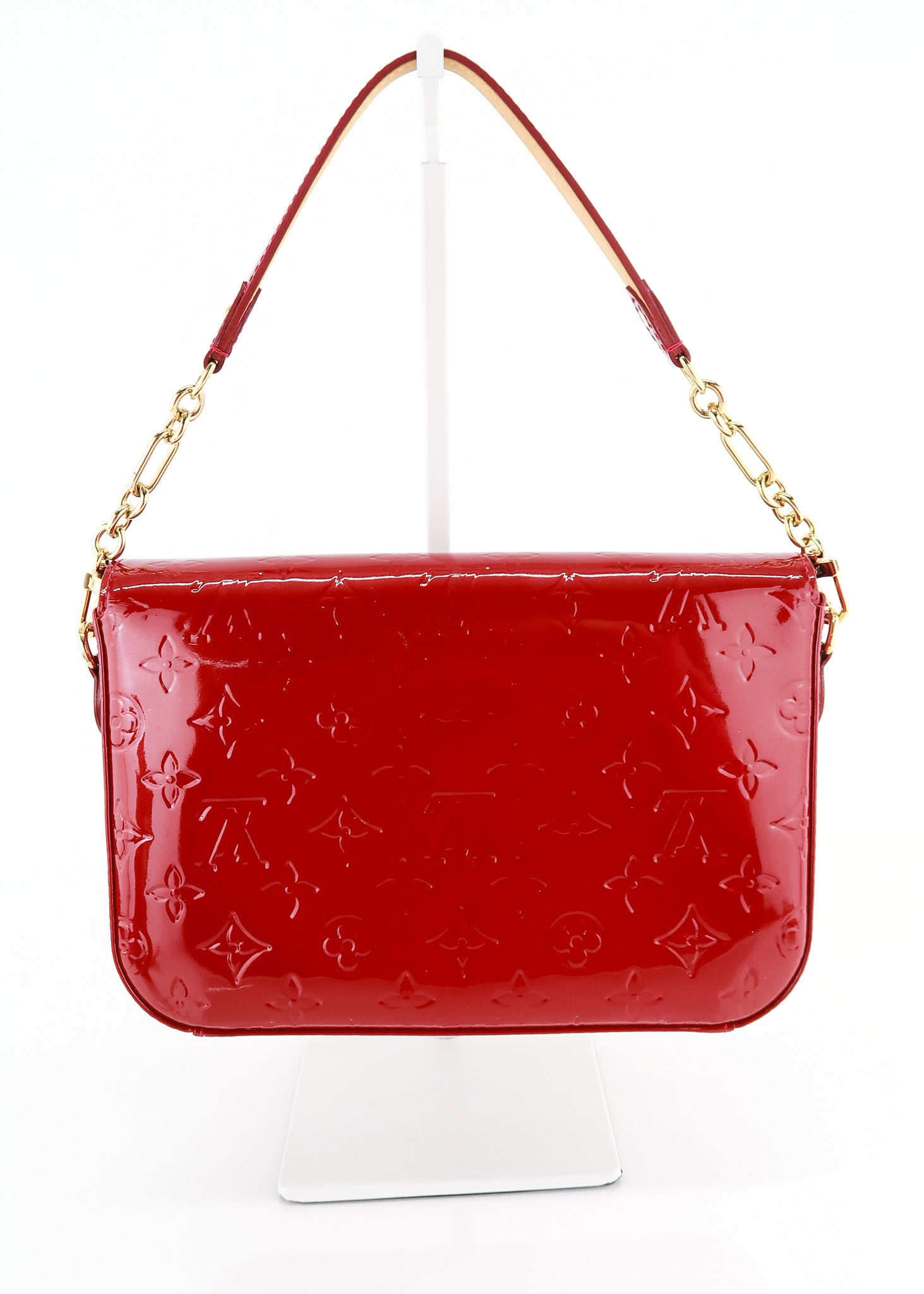This Louis Vuitton Vernis Monogram Rodeo in Red features a boxy shape, flap opening, extra roomy interior (fits full size wallets, phones etc), removable strap and a beautiful red monogram color! The perfect holiday bag! Designer Arm Candy guarantees 100% authenticity of this item. See pics for more details.