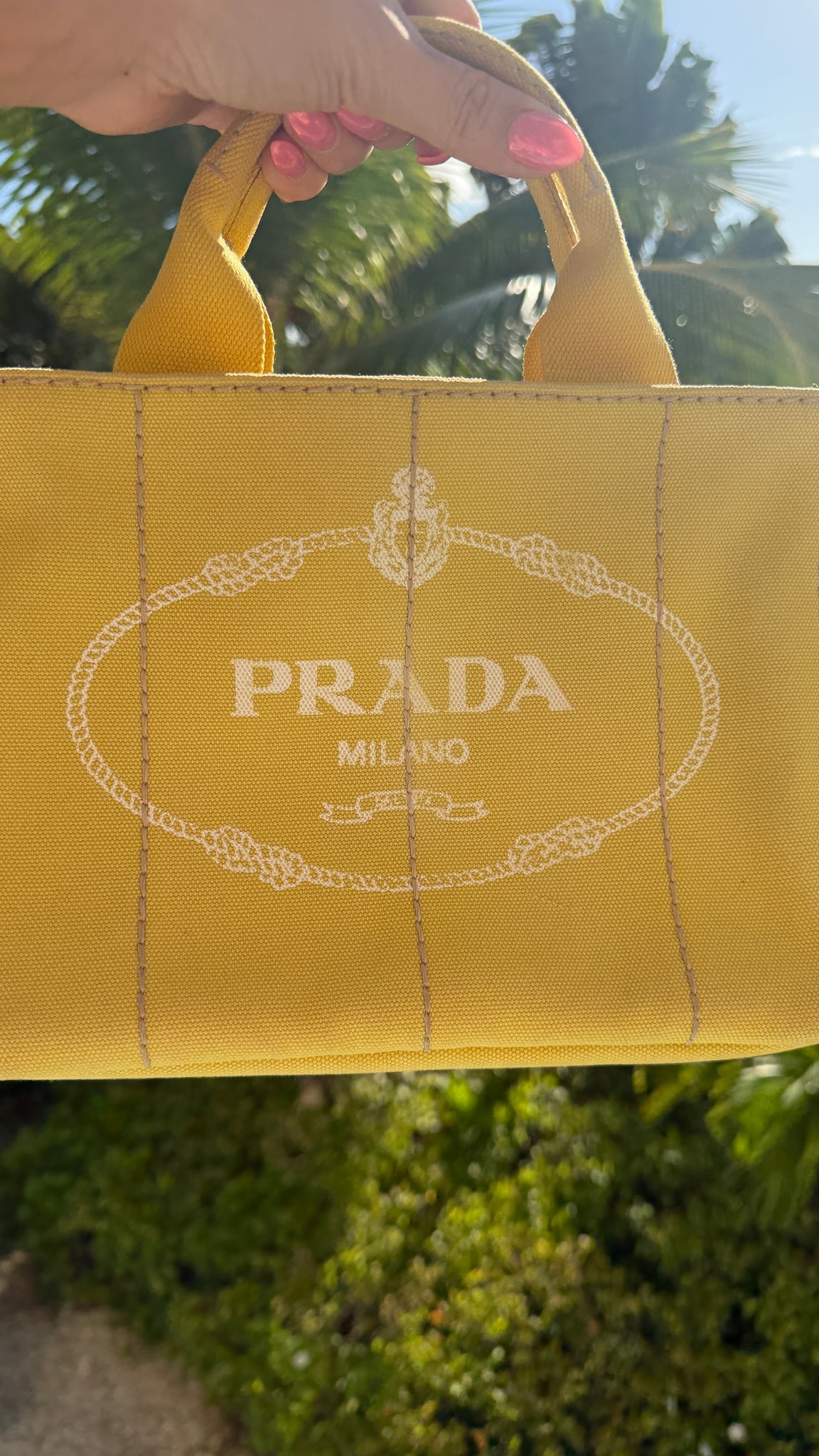 This Prada Canapa Canvas Tote in Yellow features the iconic logo on the front, double handles, roomy interior and interior pockets! Designer Arm Candy guarantees 100% authenticity of this item. See pics for more details.