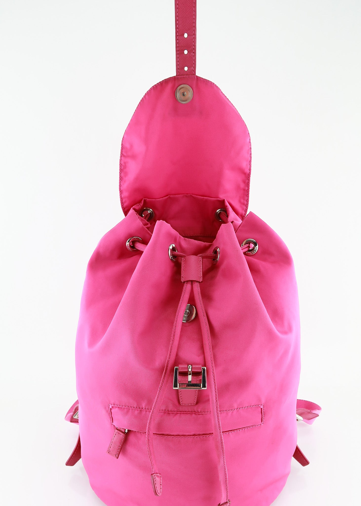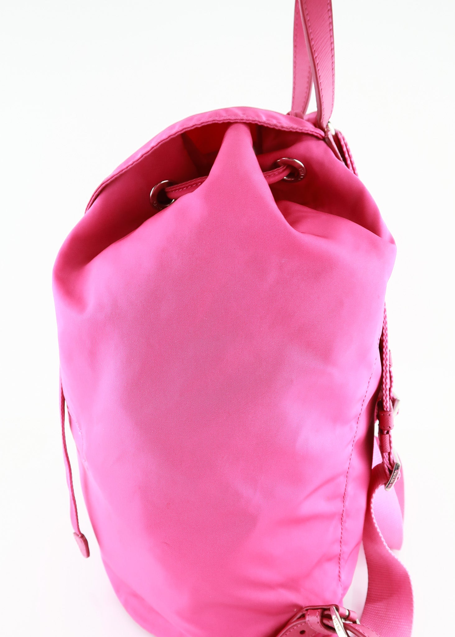 This Prada Nylon Vela Backpack in pink features a draw string entry, magnetic snap closure, large interior, front zipper pocket and wide adjustable shoulder straps. Rare color find! Perfect for travel because it’s very easy to clean! Designer Arm Candy guarantees 100% authenticity of this item. See pics for more details.
