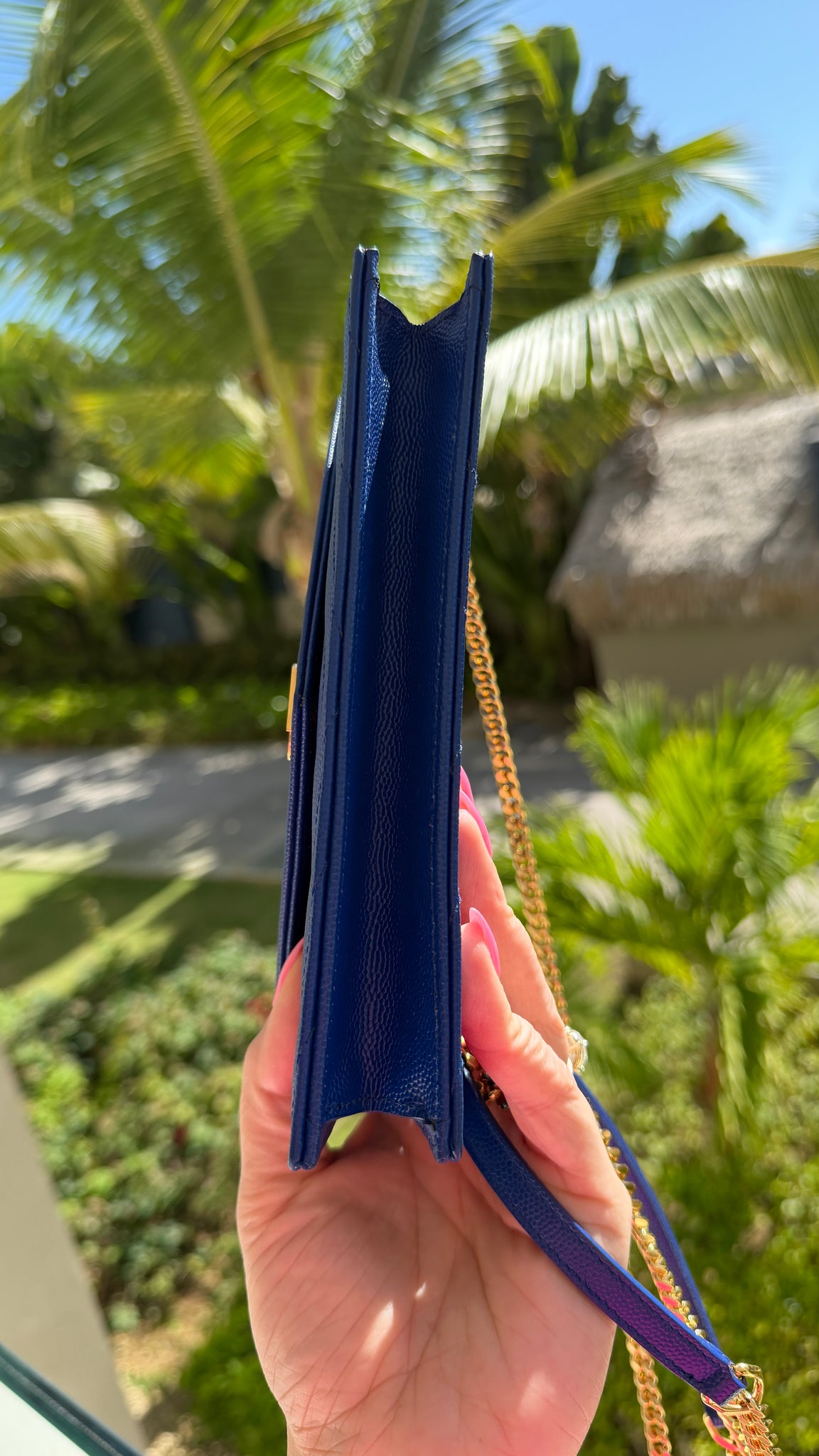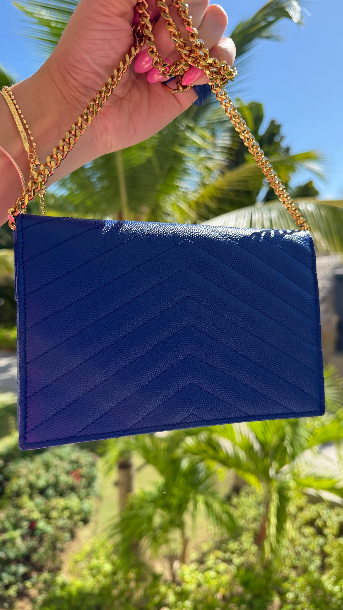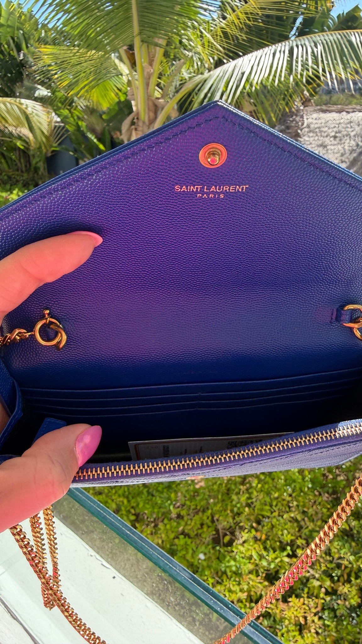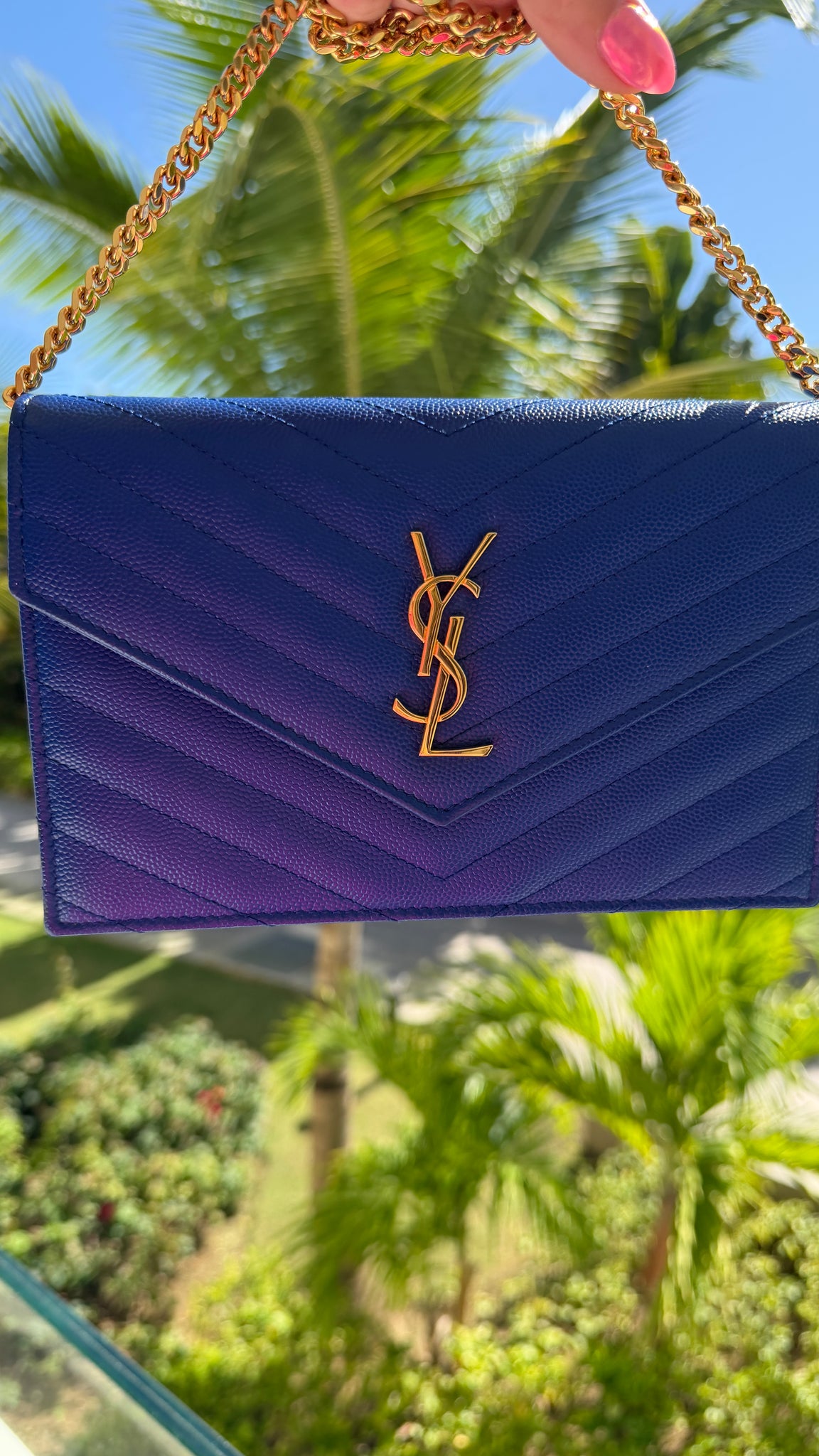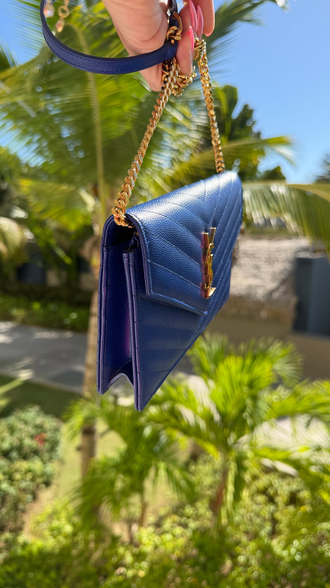 Retired color!! This Saint Laurent Cassandra Matelasse Chain Wallet in Royal Blue Grain de Poudre features an envelope opening with gold logo, removable gold chain strap with shoulder pad, 6 card slots, 1 side wall pockets, zipper pocket and are perfect for bigger phones, keys and more! Designer Arm Candy guarantees 100% authenticity of this item. See pics for more details.