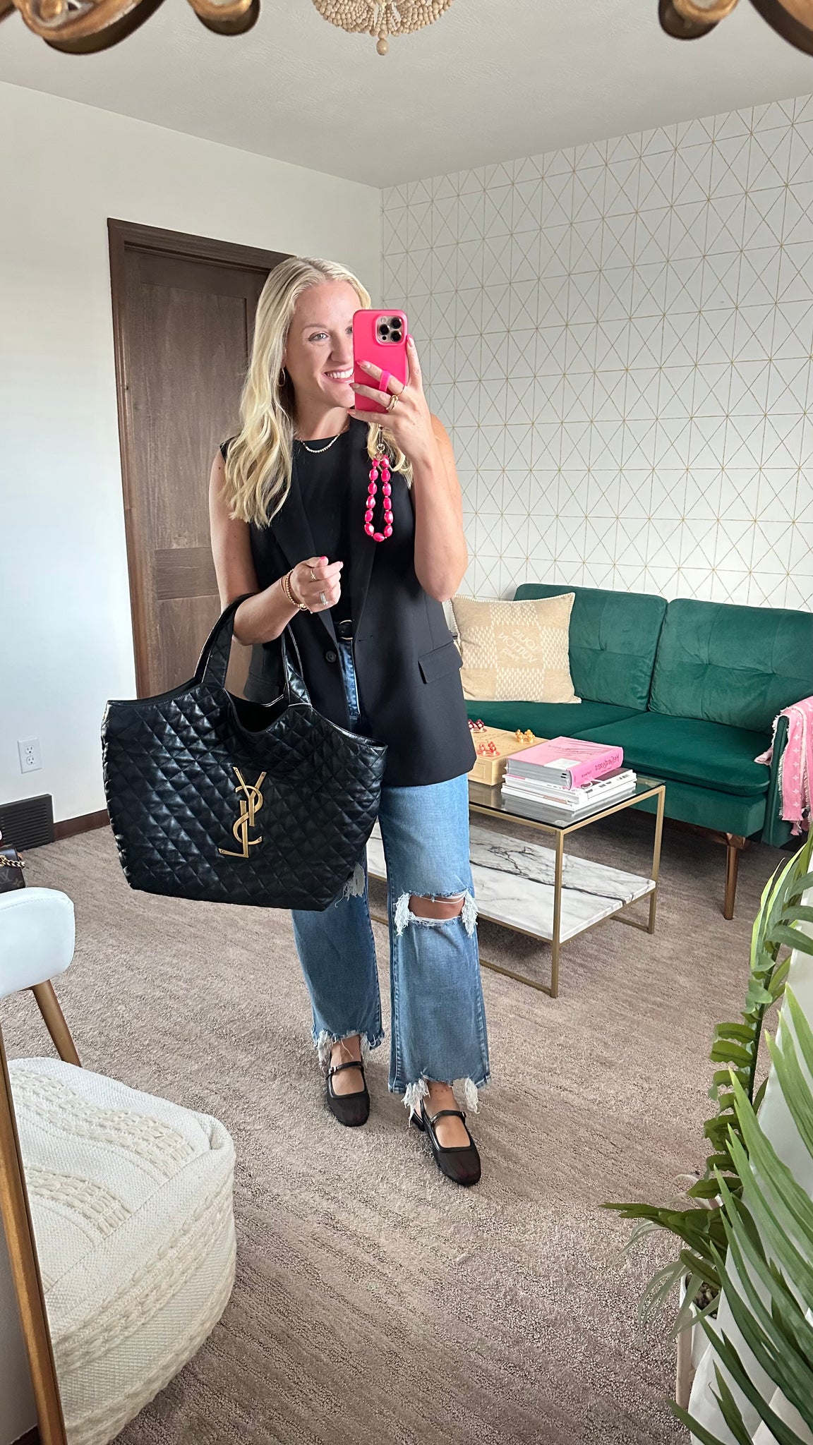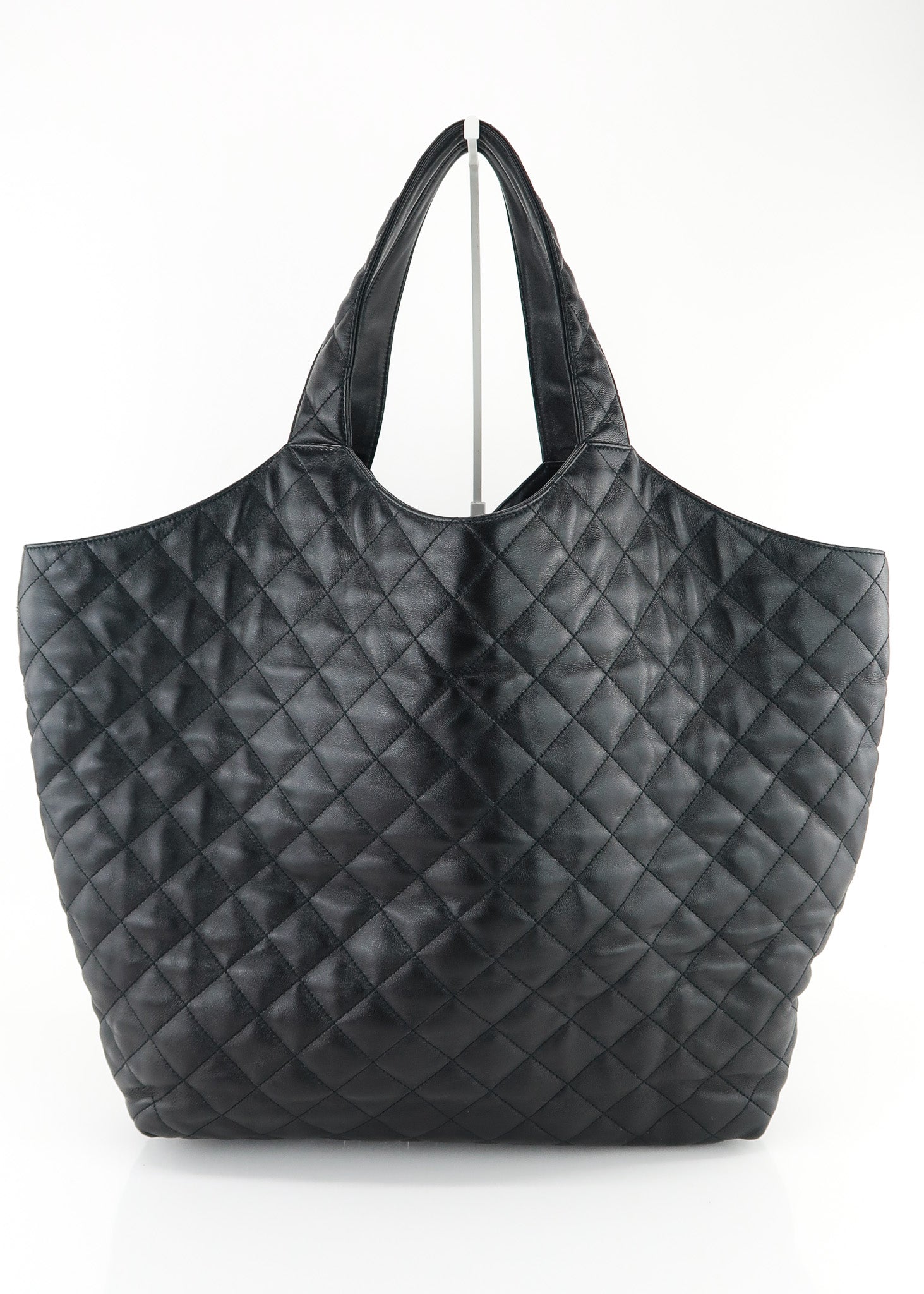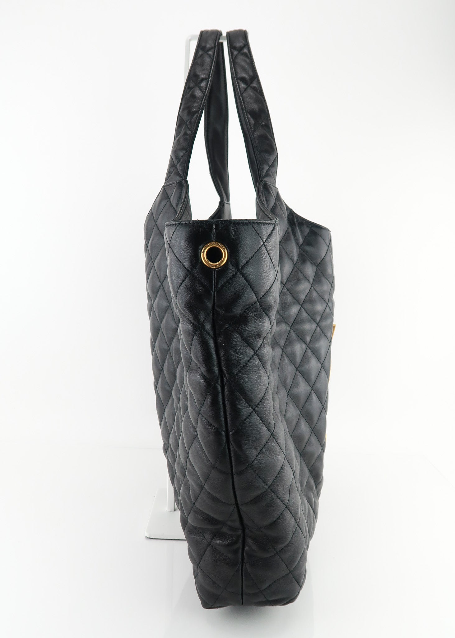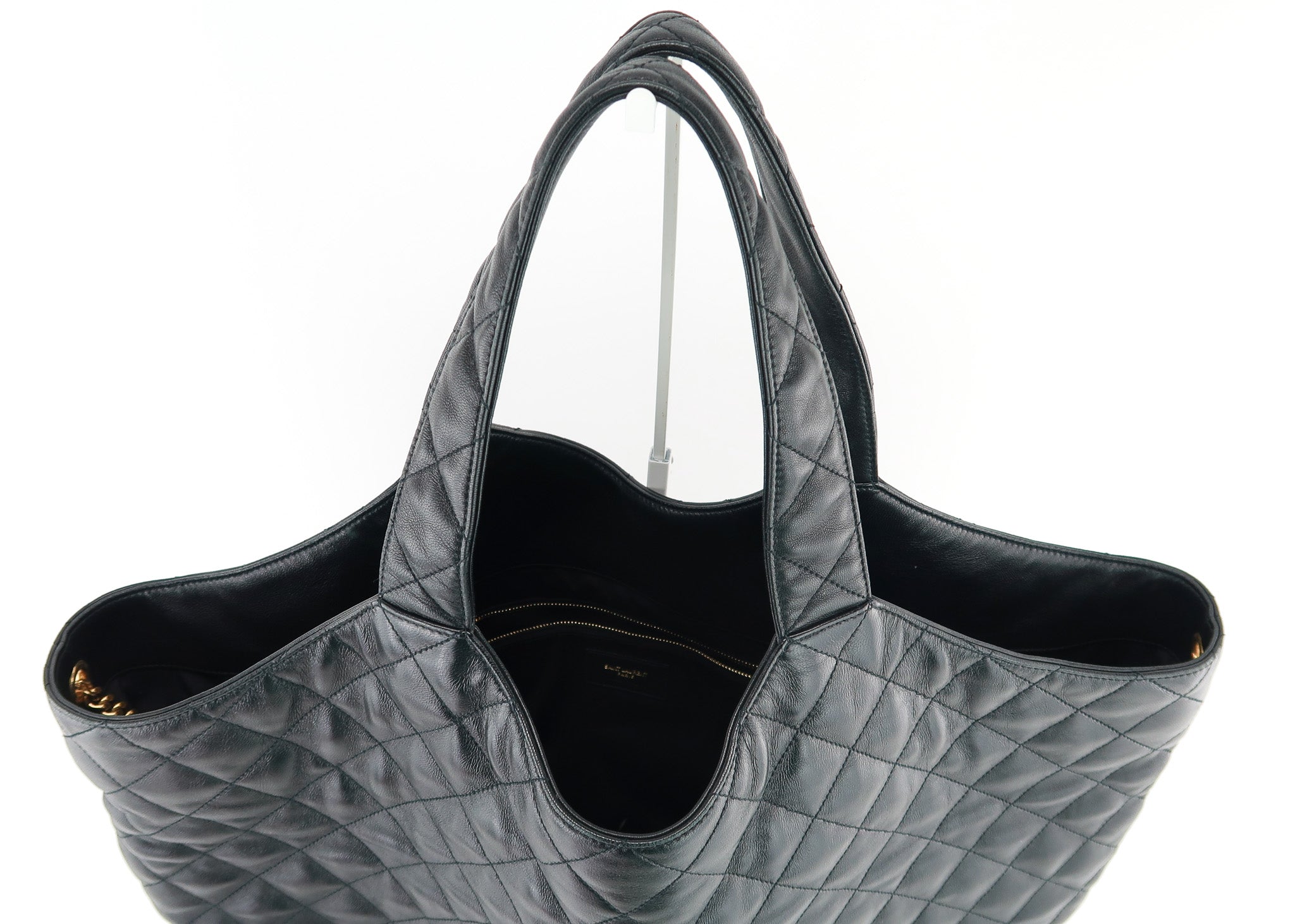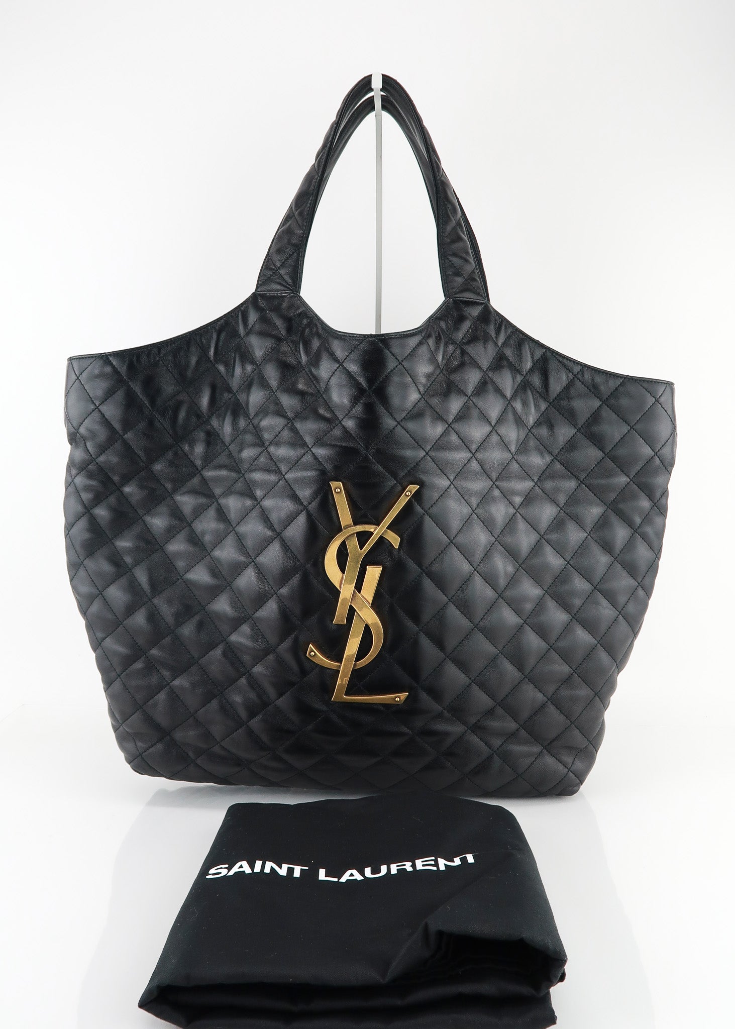 This Saint Laurent Icare Shopping Tote is the “it bag” right now, and hard to find! The bag features a quilted black Lambskin leather, oversized brass logo, pochette that can be removed at anytime, extra large interior and interior zipper pocket. Perfect for shopping, travel or diaper bag! Designer Arm Candy guarantees 100% authenticity of this item. See pics for more details.