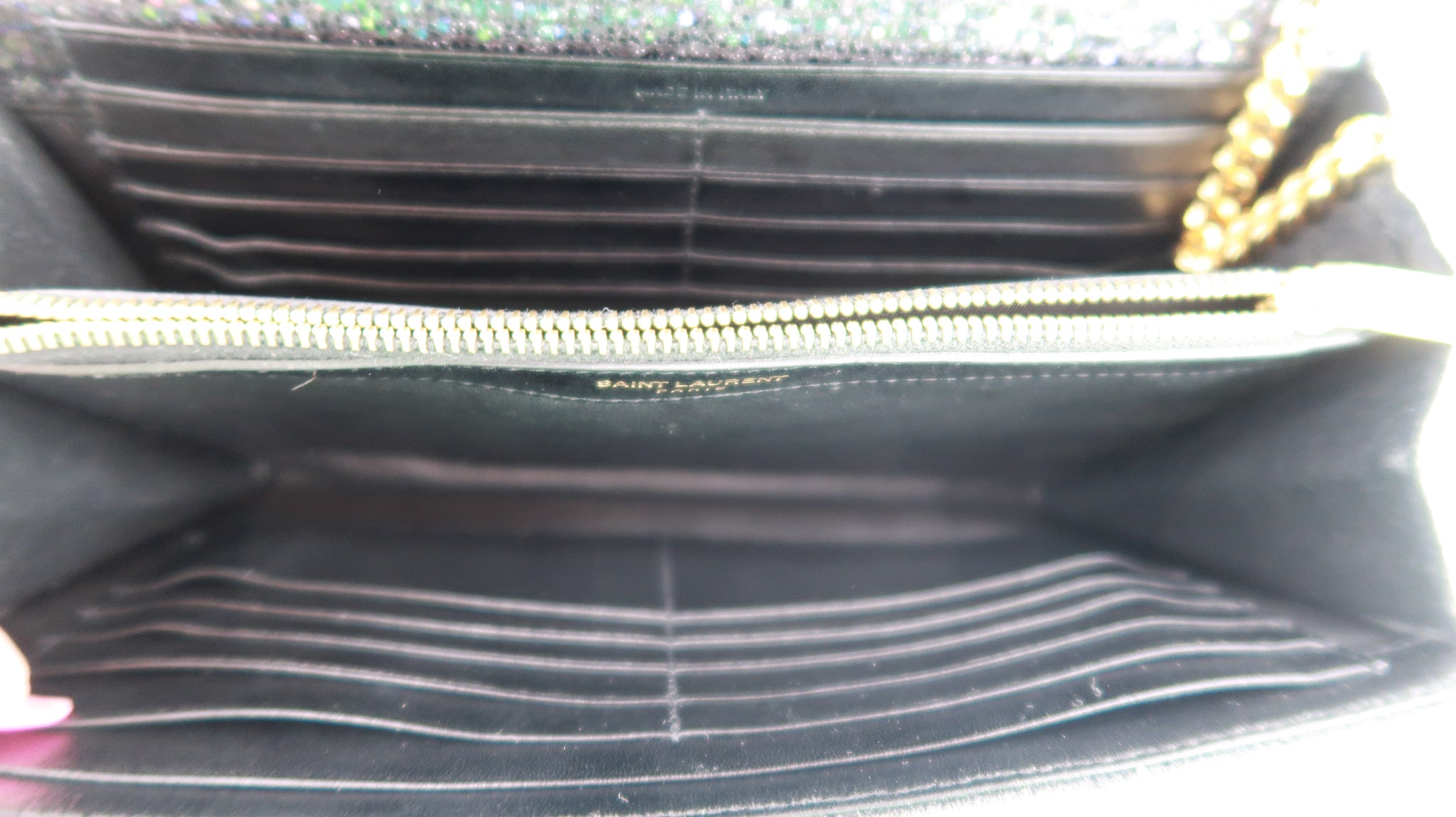 RARE! This Saint Laurent Monogram Glitter Wallet on Chain in Black features a rectangle shape, sparkly exterior with gold monogram logo, snap closure, leather interior with 10 built in card slots and a gold chain shoulder strap! Great for a night out with the gals! Designer Arm Candy guarantees 100% authenticity of this item. See pics for more details.