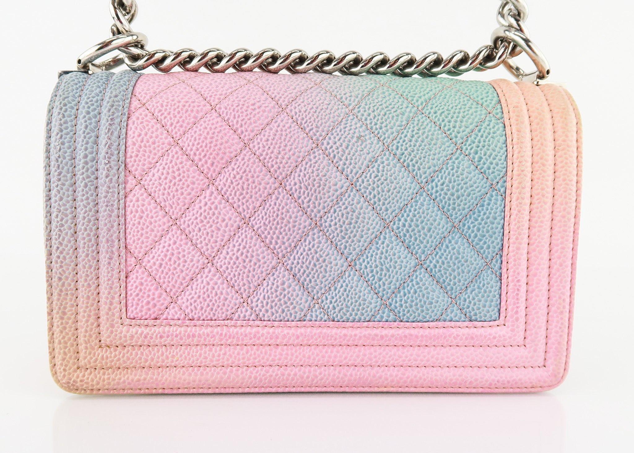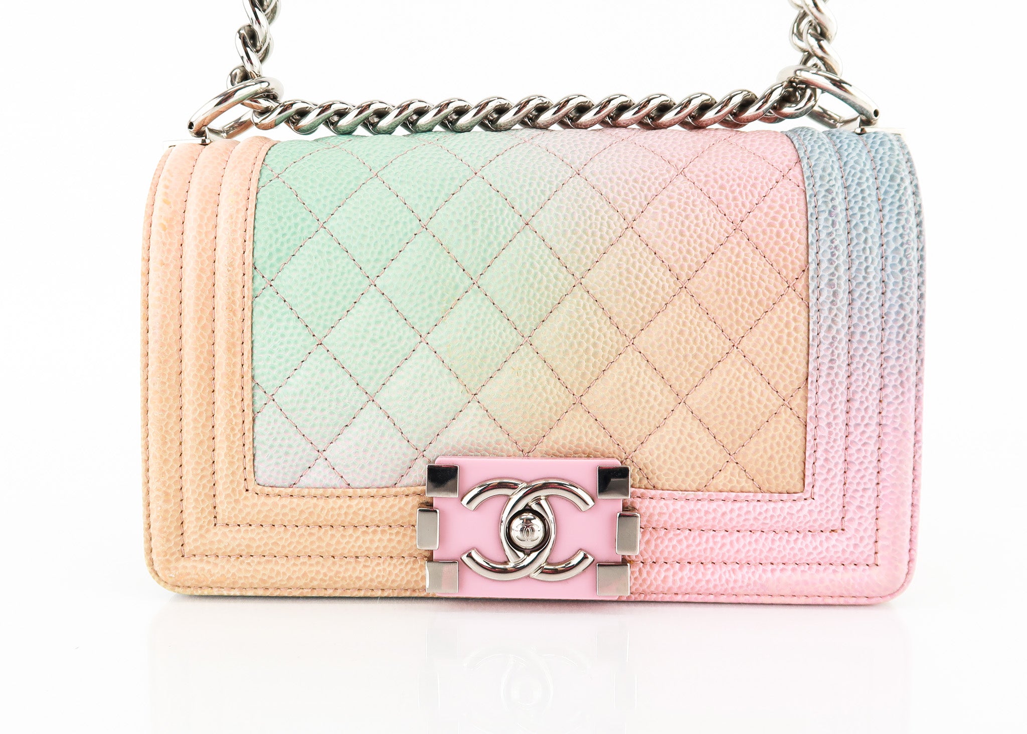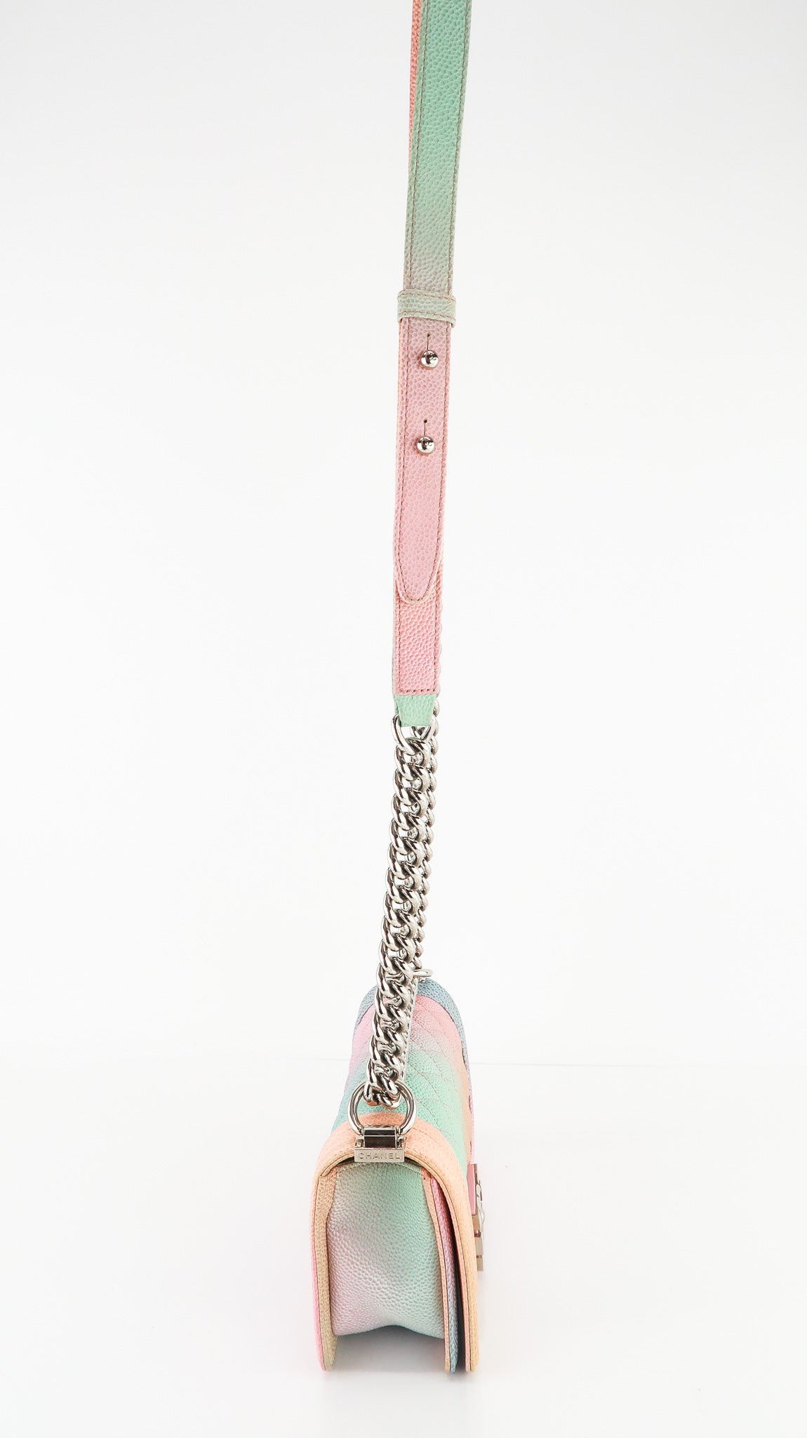 This Chanel Boy Cuba Small Flap in Pastel Rainbow Colors features a push lock entry, roomy interior with pocket, silver hardware and leather shoulder pad that is adjustable. Designer Arm Candy guarantees 100% authenticity of this item. See pics for more details.