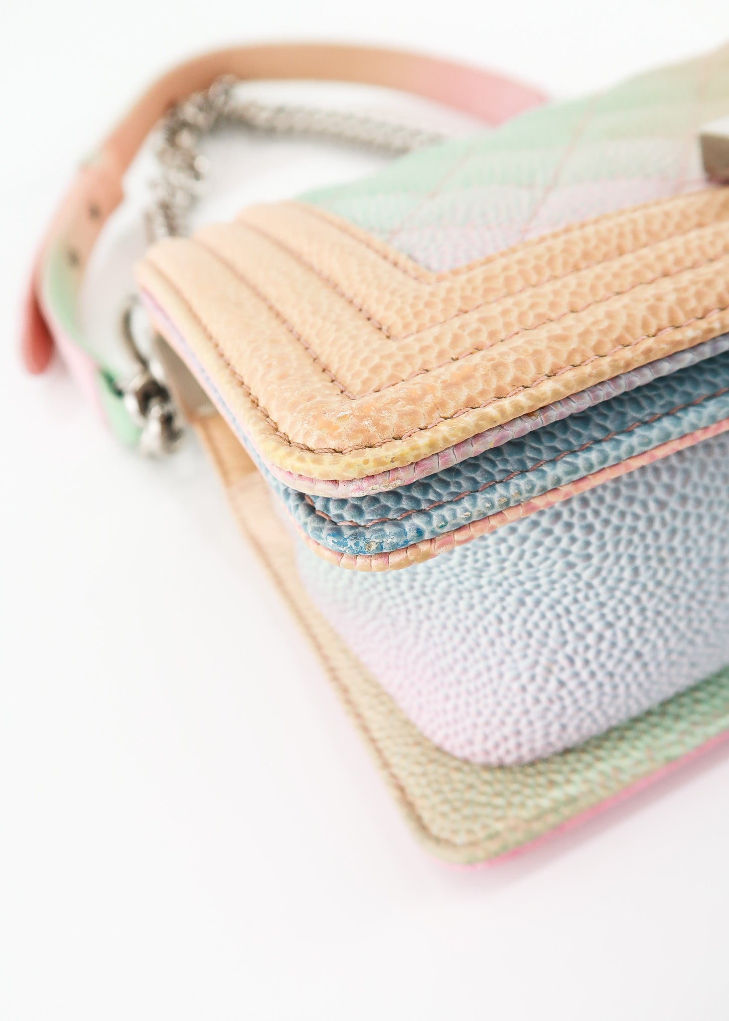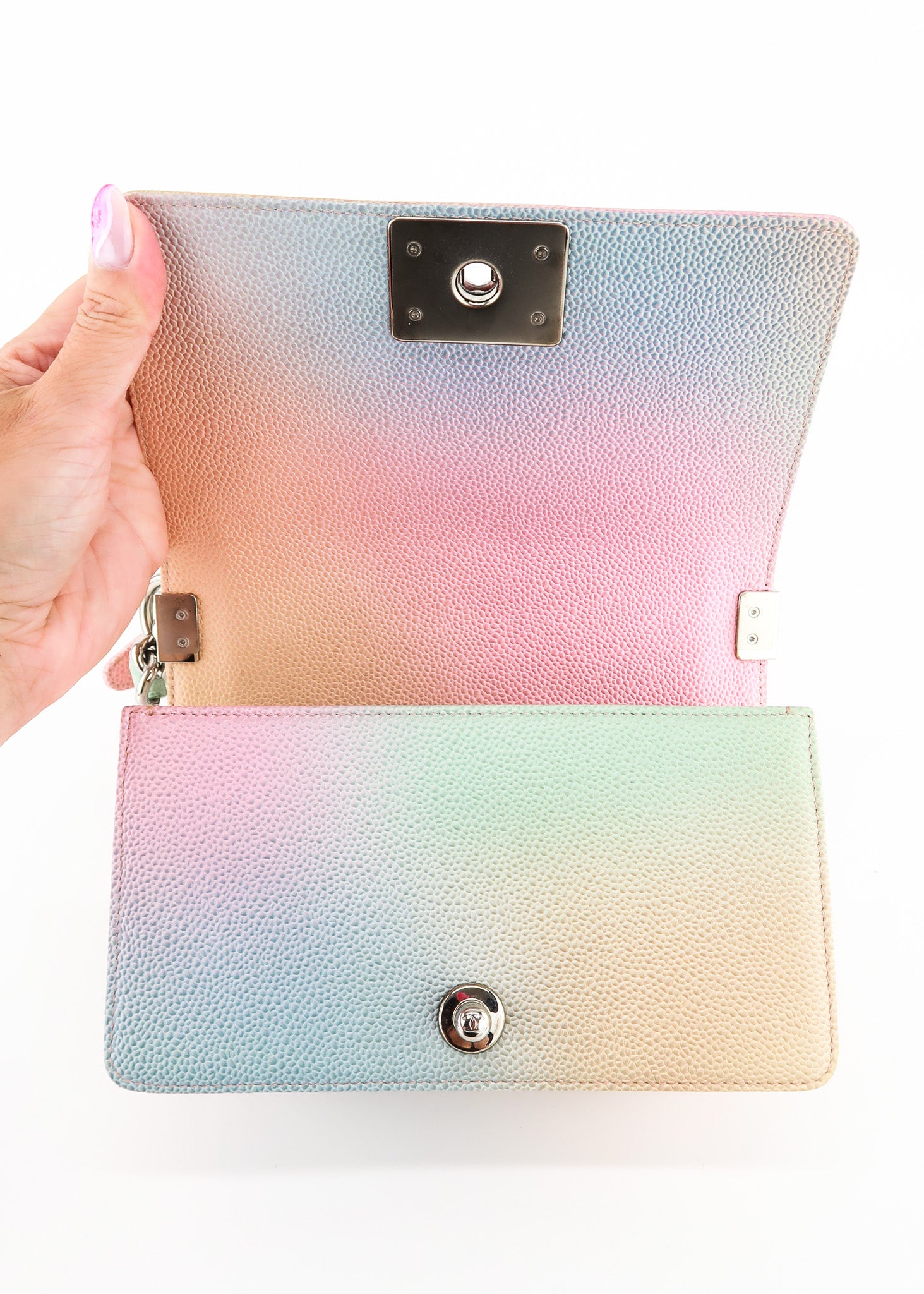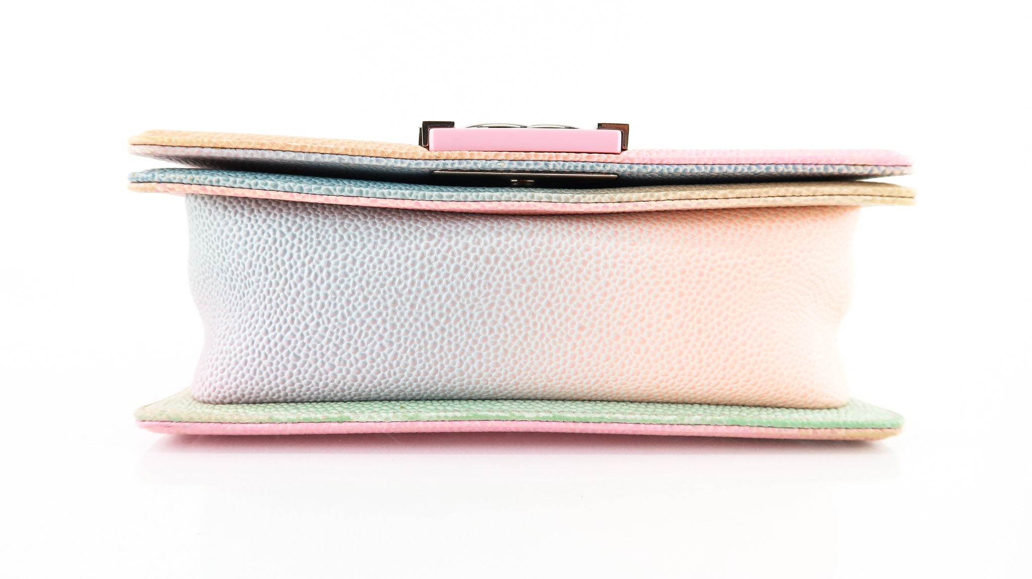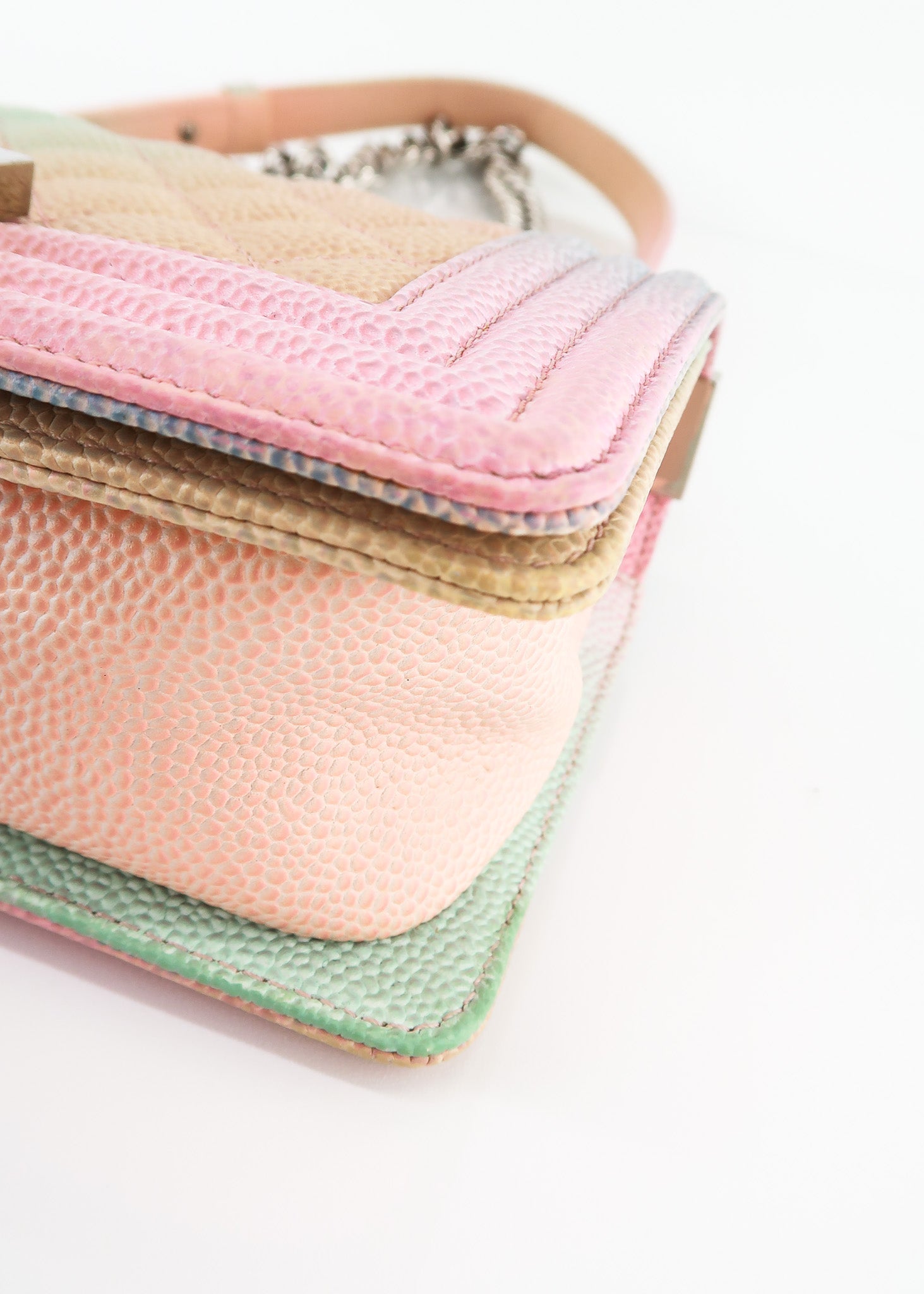 This Chanel Boy Cuba Small Flap in Pastel Rainbow Colors features a push lock entry, roomy interior with pocket, silver hardware and leather shoulder pad that is adjustable. Designer Arm Candy guarantees 100% authenticity of this item. See pics for more details.