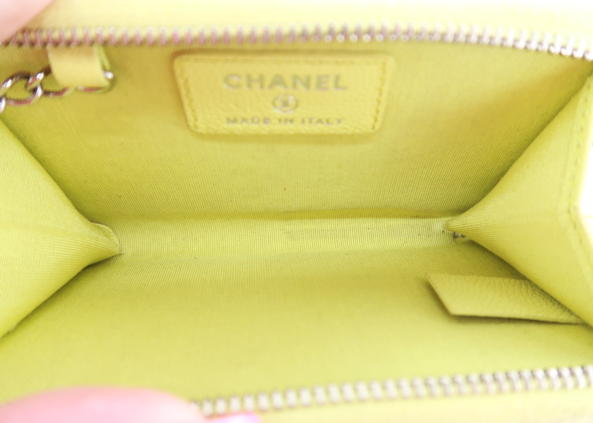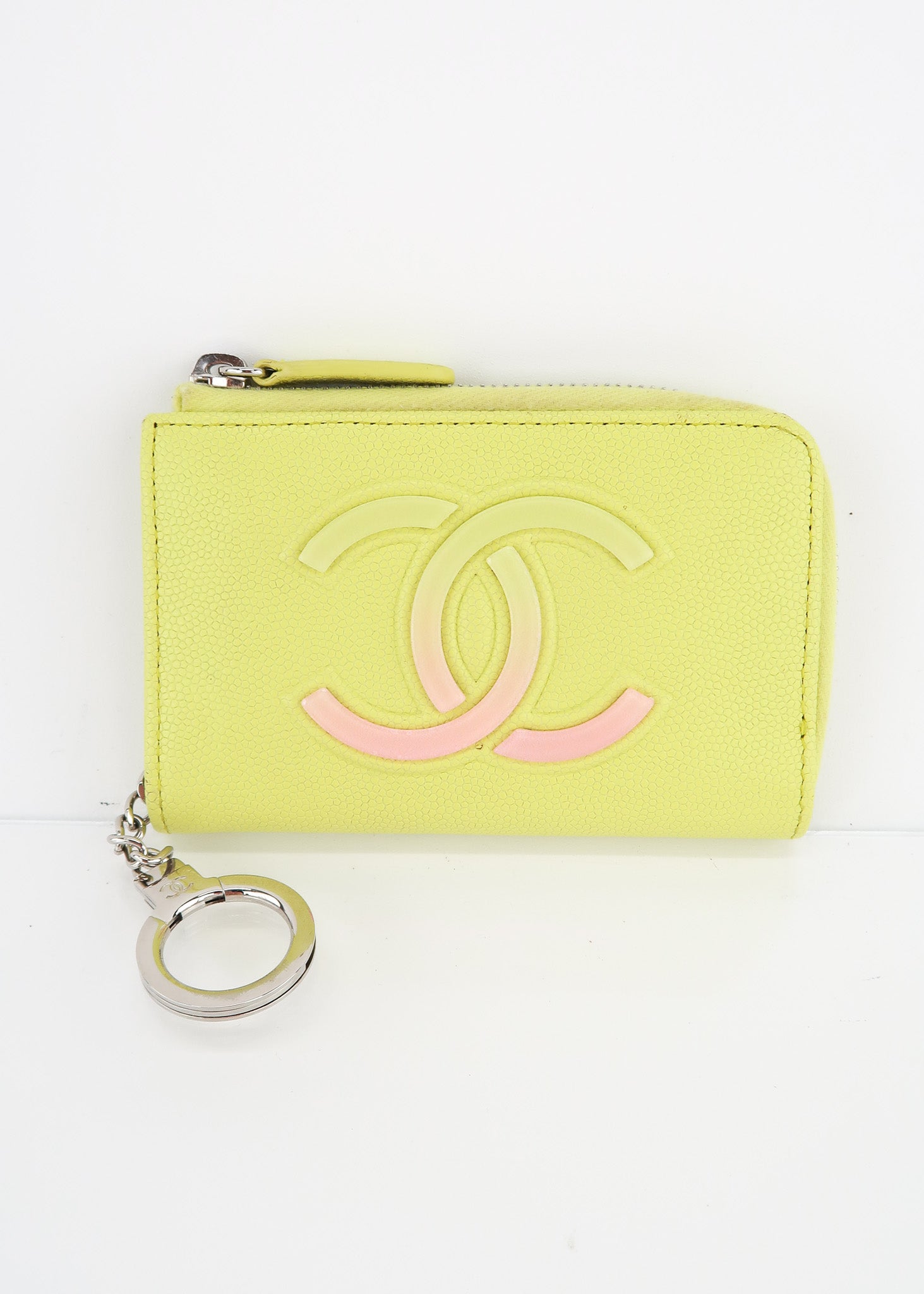 This Chanel Caviar Zipped Key Pouch in Yellow features a rectangle shape, caviar leather which is very durable, zipper closure and key ring that makes it easy to connect to your keys. These are very hard to come by! Designer Arm Candy guarantees 100% authenticity of this item. See pics for more details.