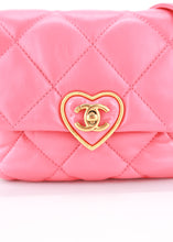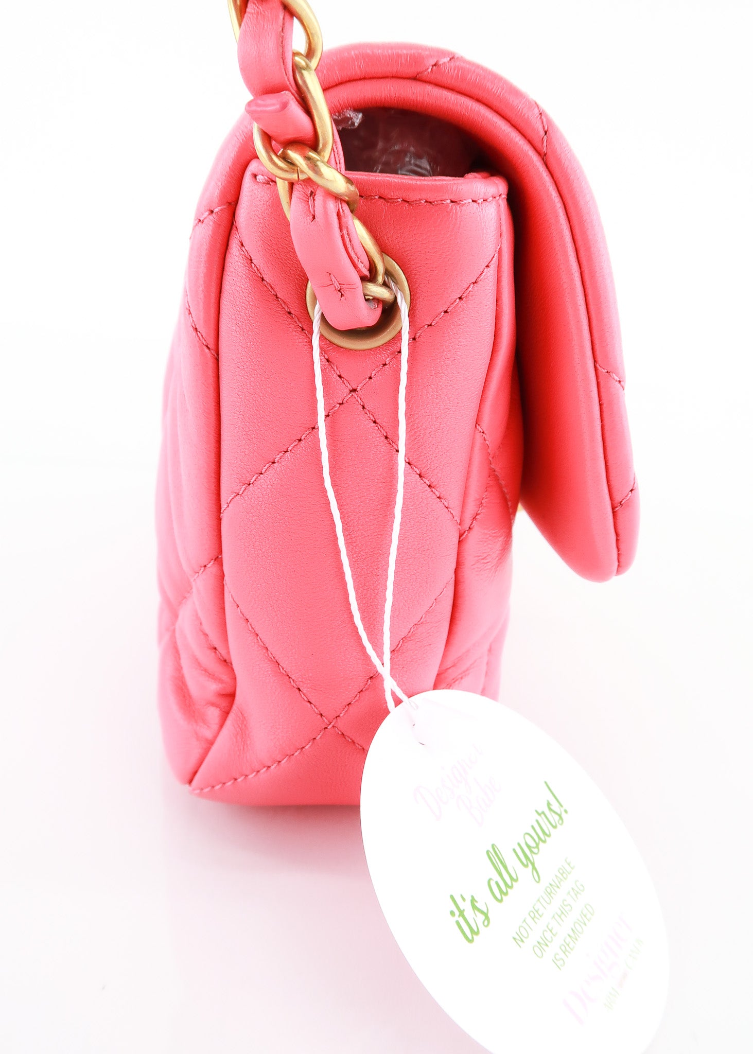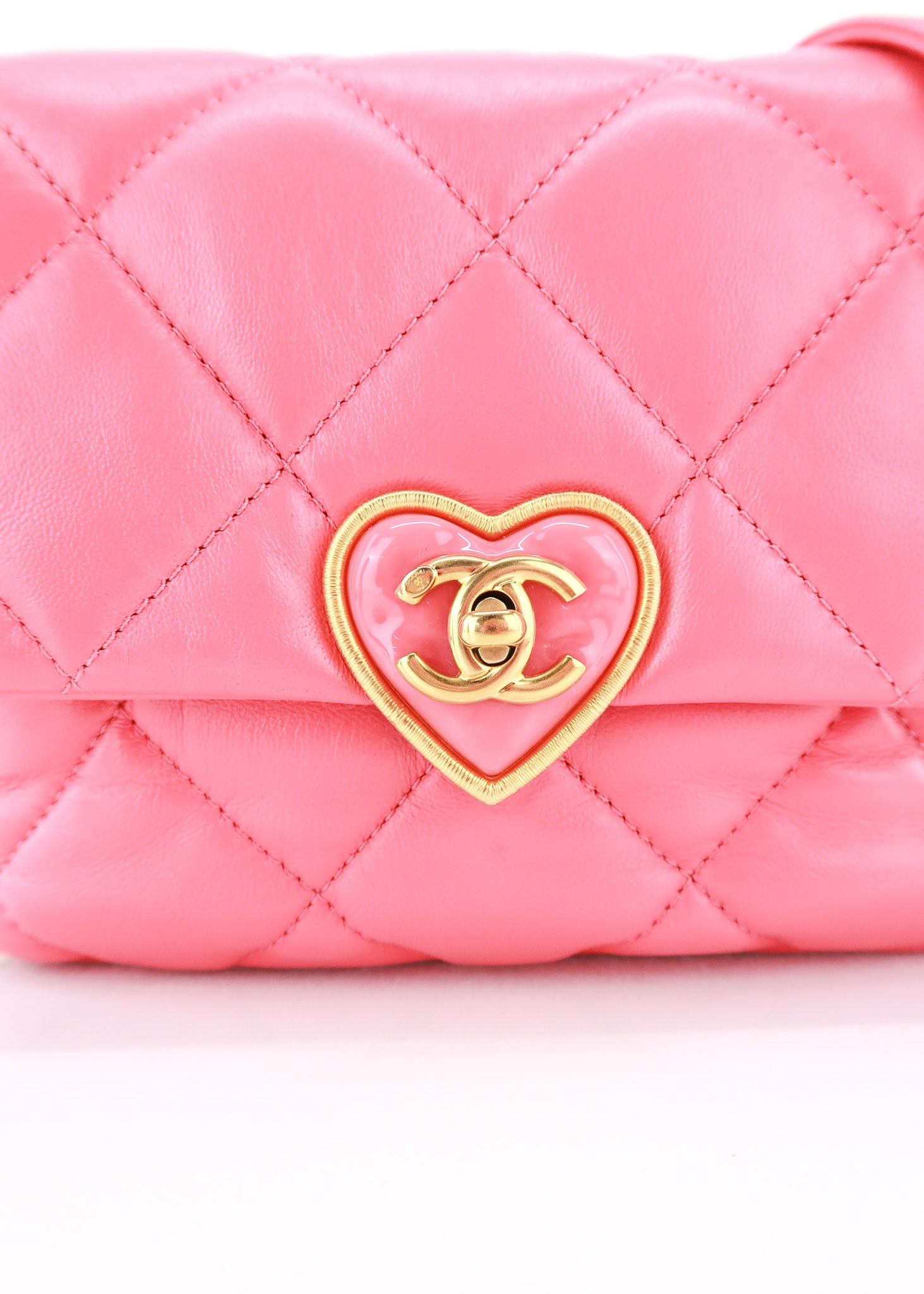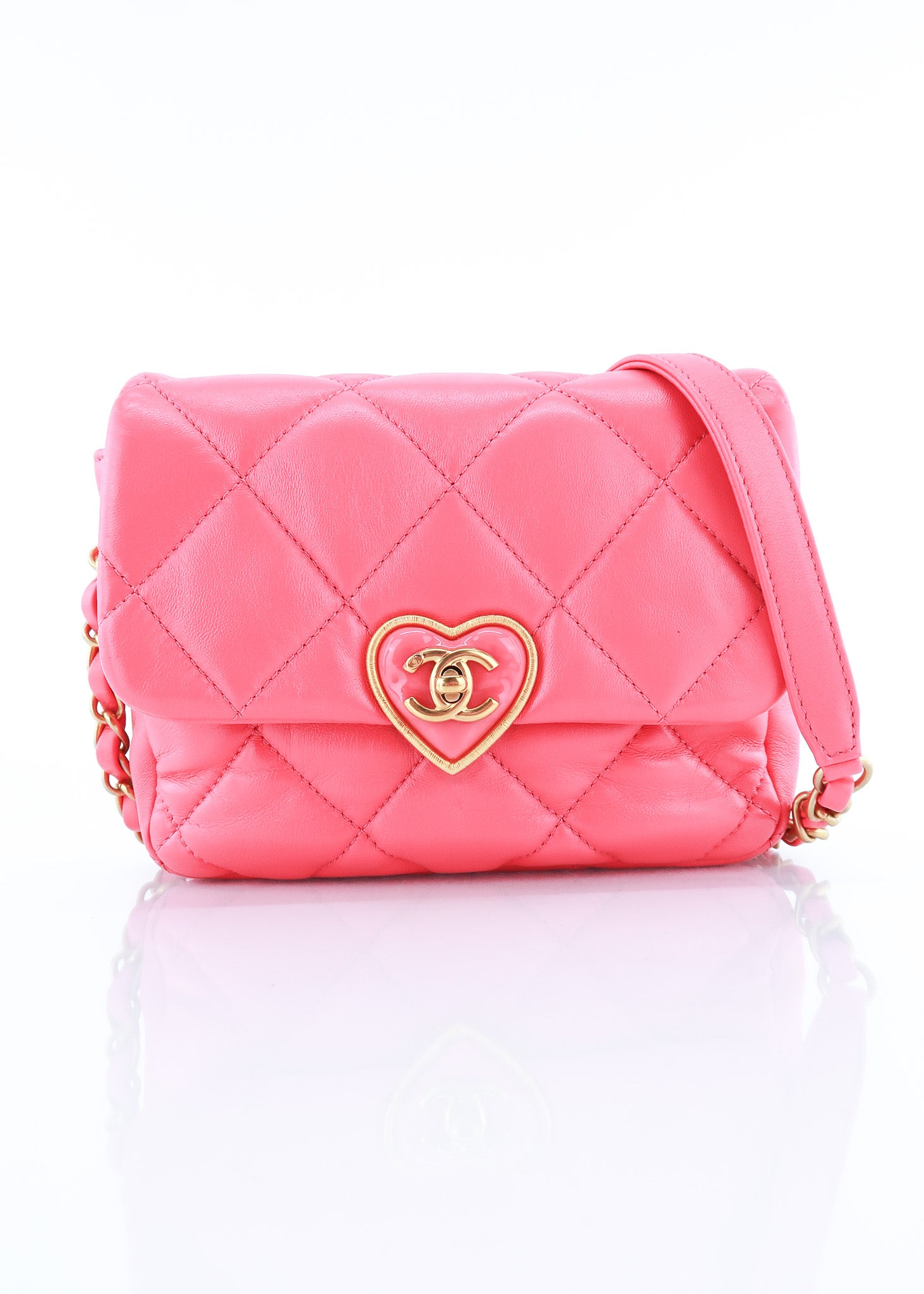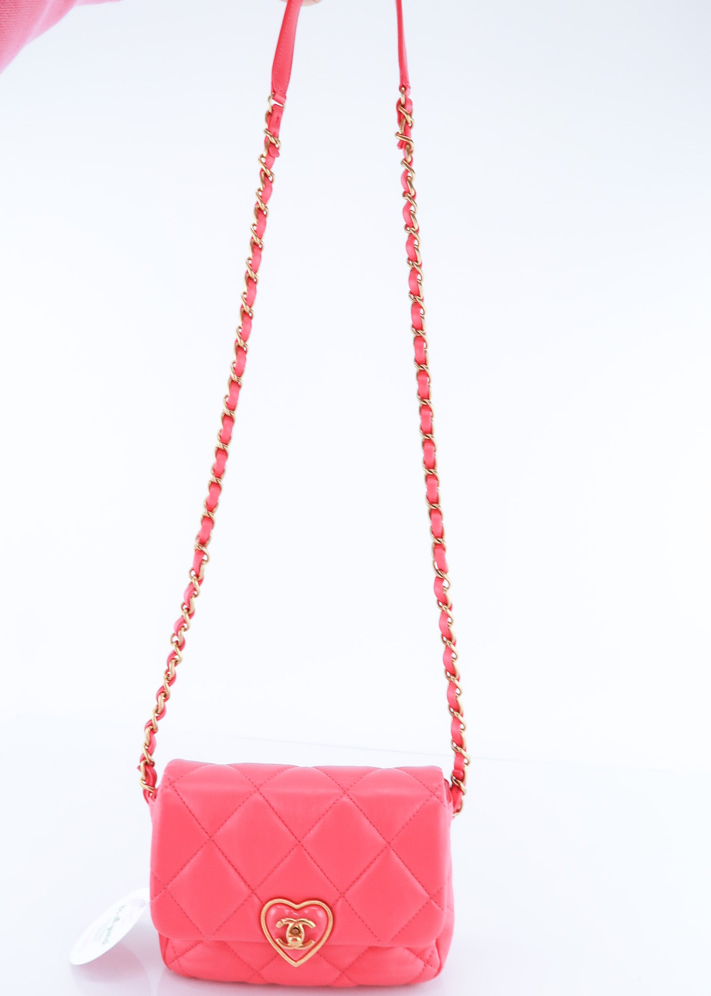 This Chanel Lambskin Plexiglass Quilted Coco Love Mini Flap in Pink features a compact crossbody size, heart logo on front with twist lock closure, roomy interior for your essentials with side pocket and woven chain strap with shoulder pad! Designer Arm Candy guarantees 100% authenticity of this item. See pics for more details.
