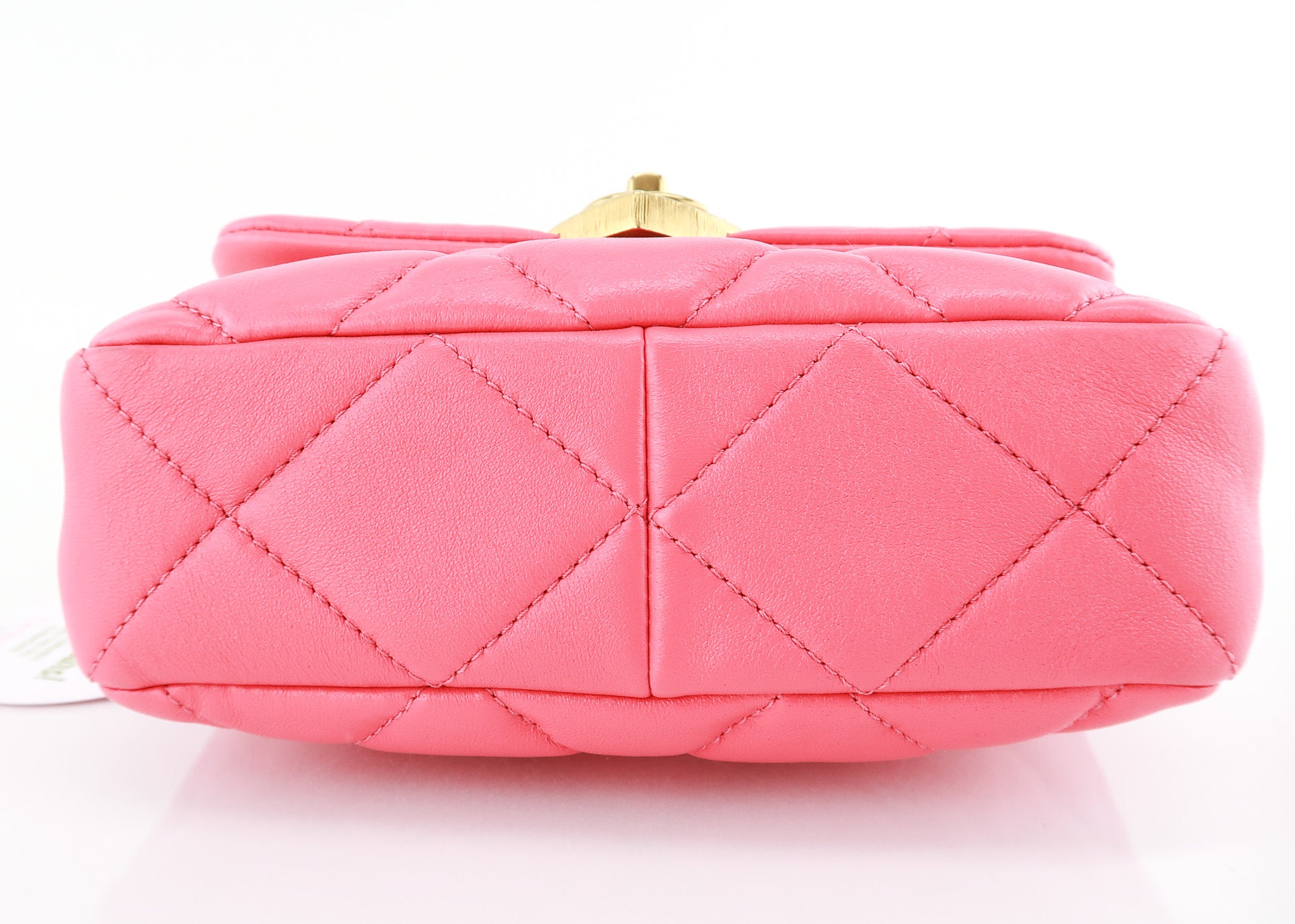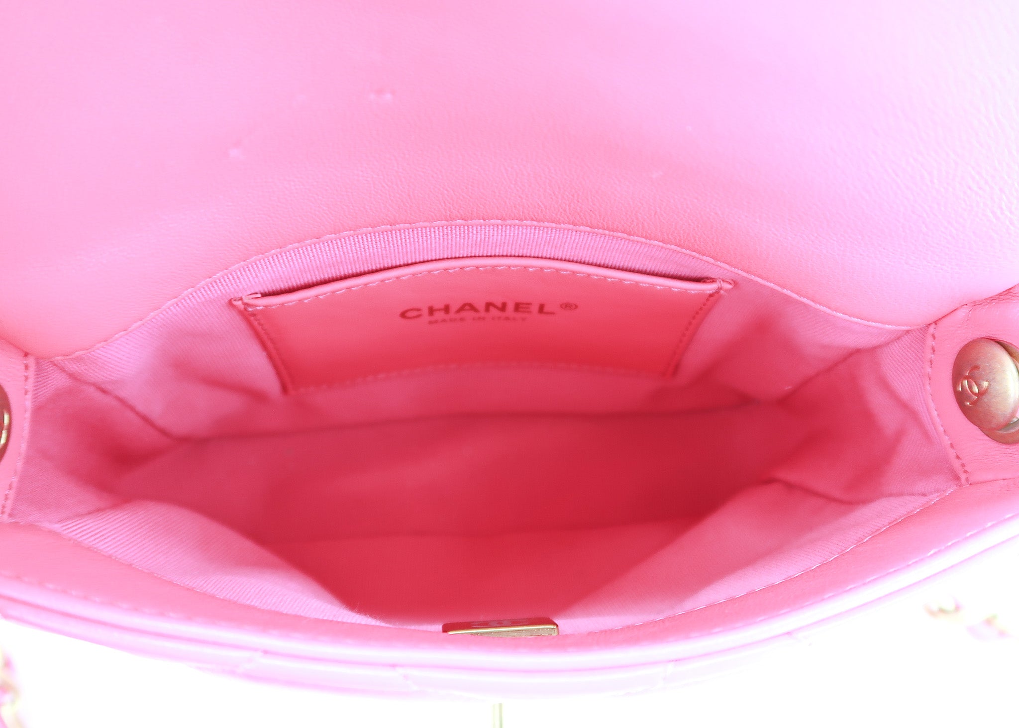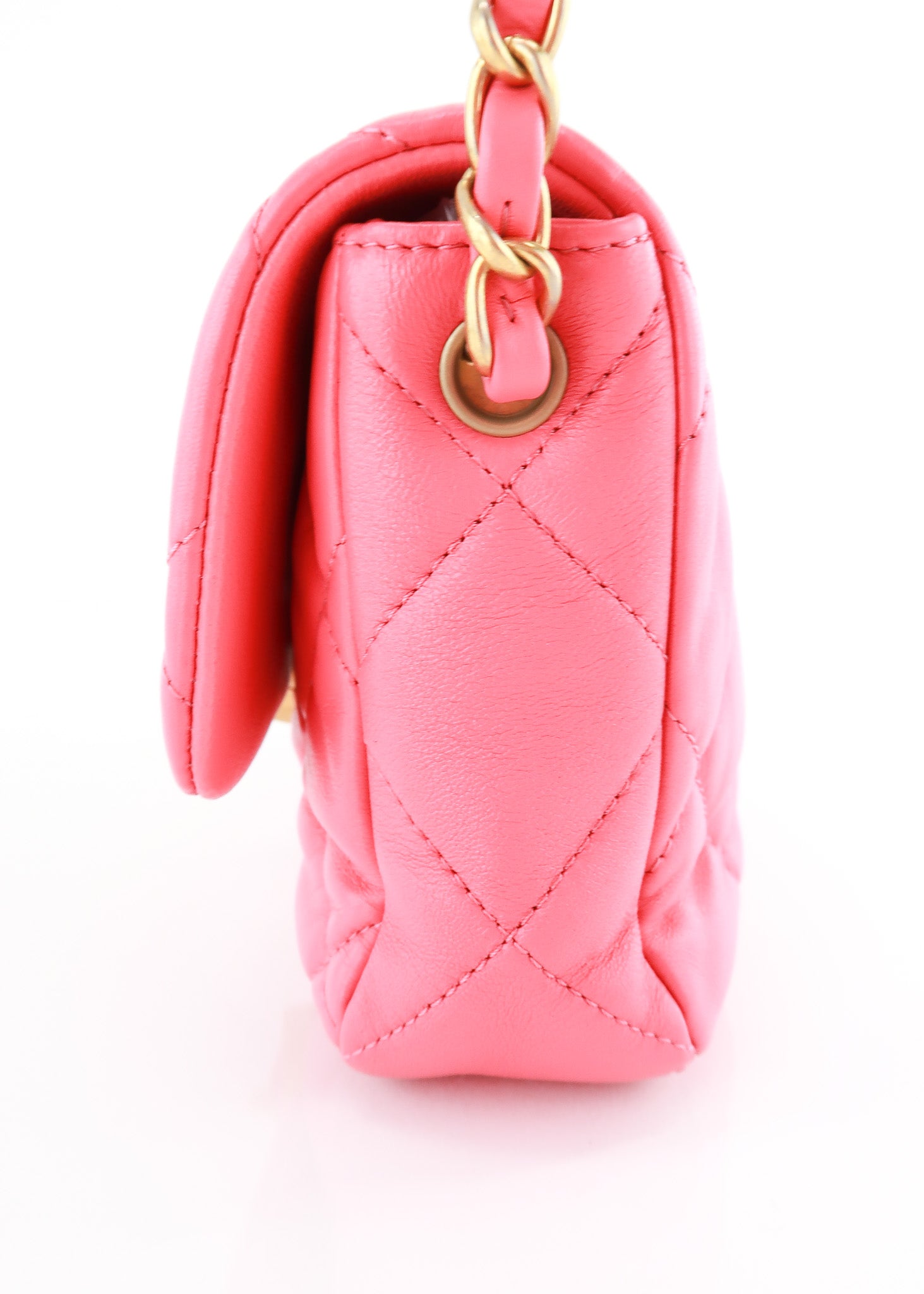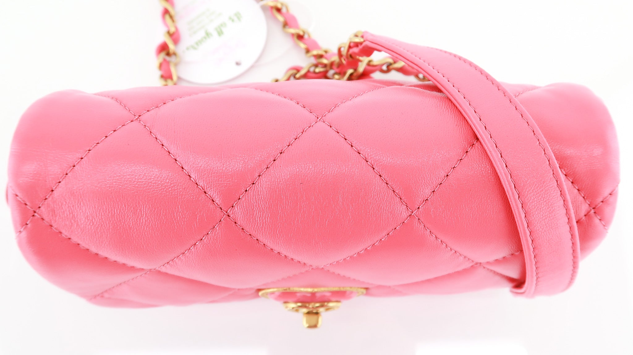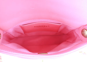 This Chanel Lambskin Plexiglass Quilted Coco Love Mini Flap in Pink features a compact crossbody size, heart logo on front with twist lock closure, roomy interior for your essentials with side pocket and woven chain strap with shoulder pad! Designer Arm Candy guarantees 100% authenticity of this item. See pics for more details.