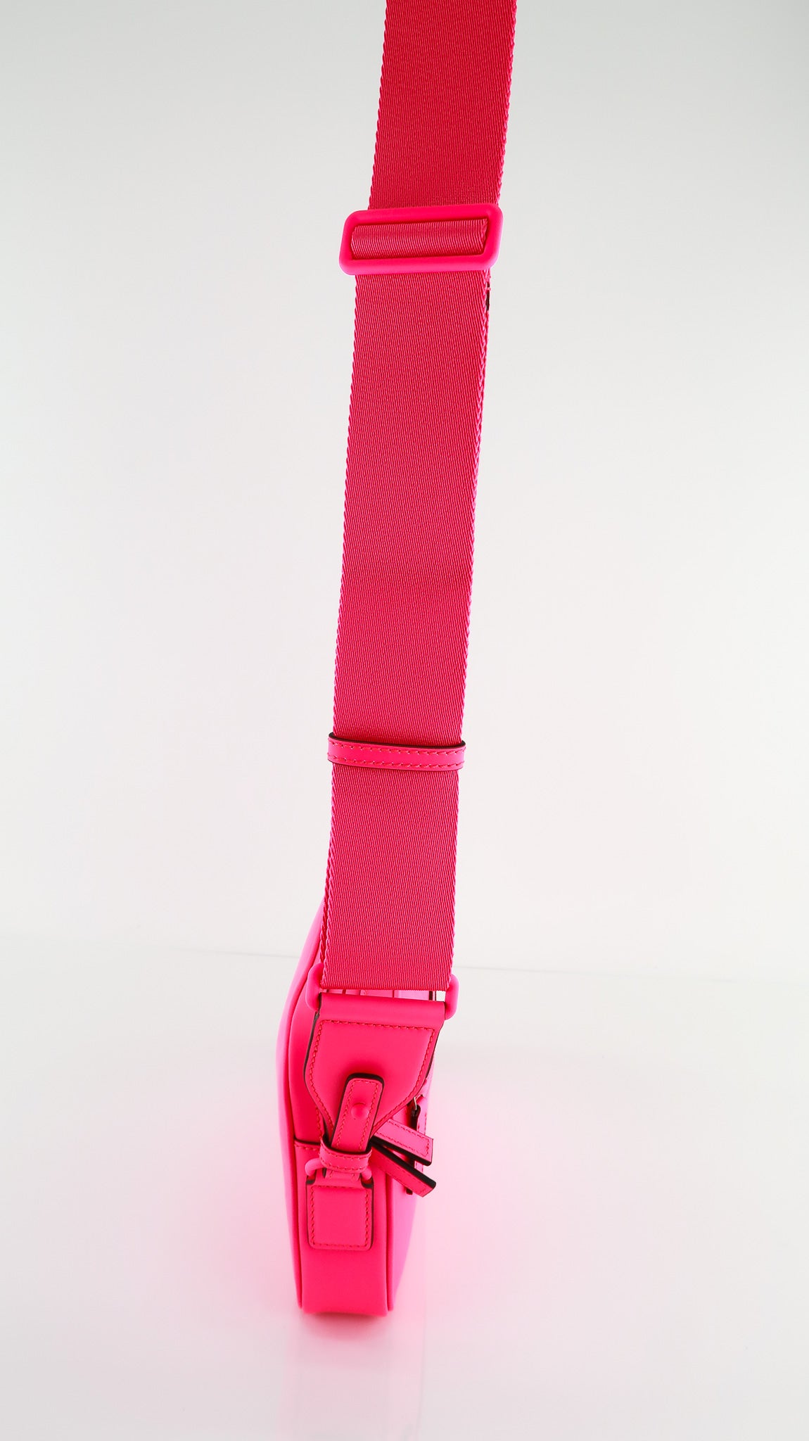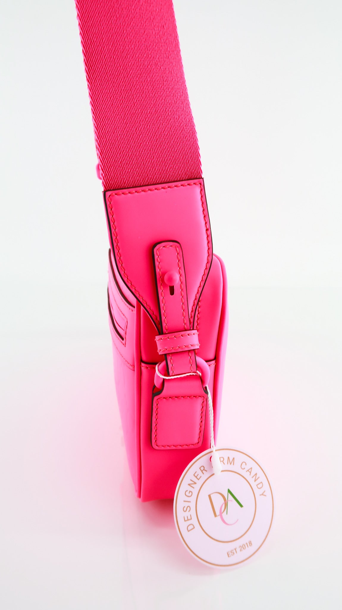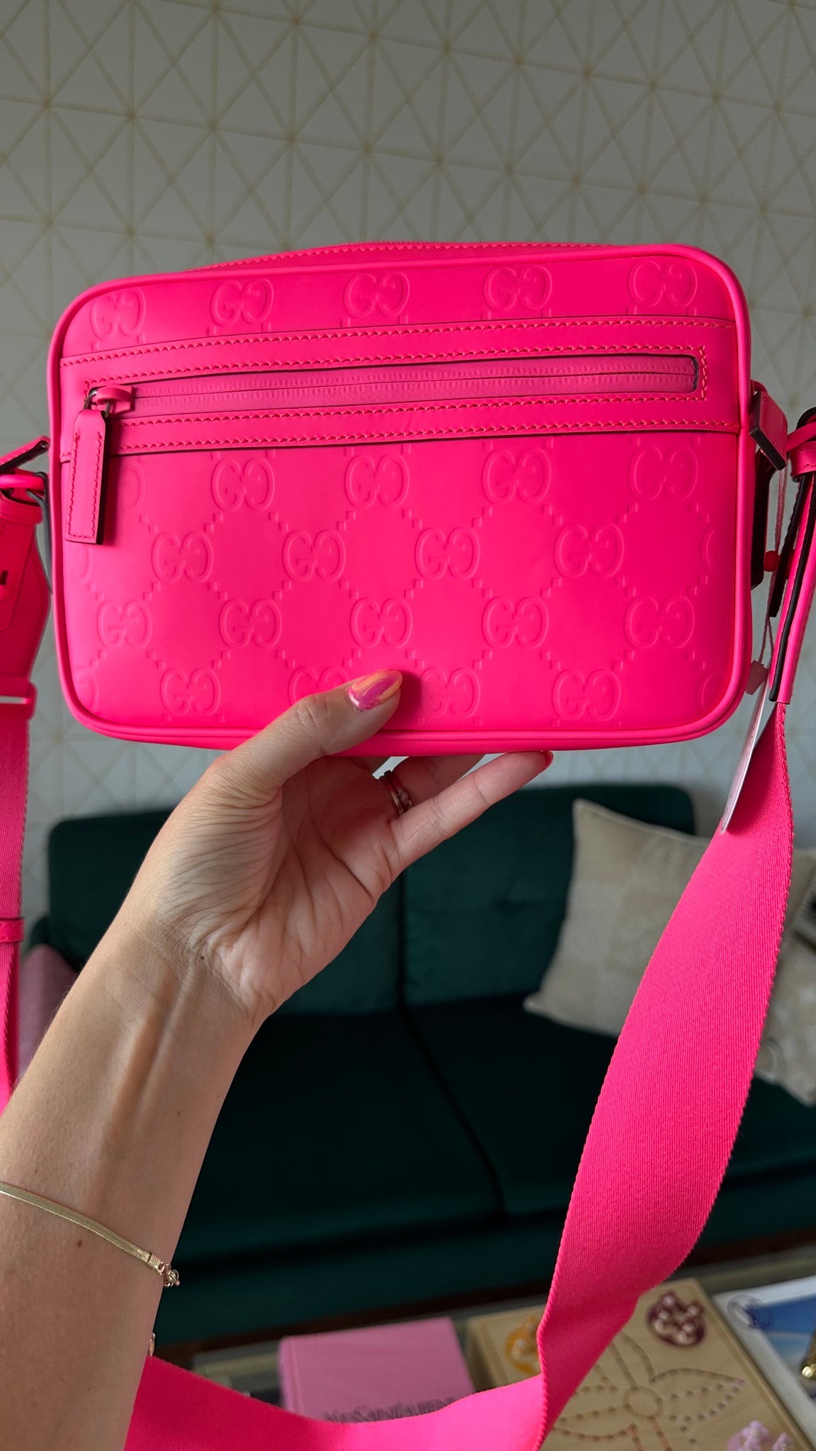 This Gucci Rubber Effect Leather Crossbody in Pink features a messenger bag style, front zipper pocket, removable shoulder strap, additional wristlet strap, zipper closure, roomy interior and in a limited edition embossed bright pink monogram! Designer Arm Candy guarantees 100% authenticity of this item. See pics for more details.